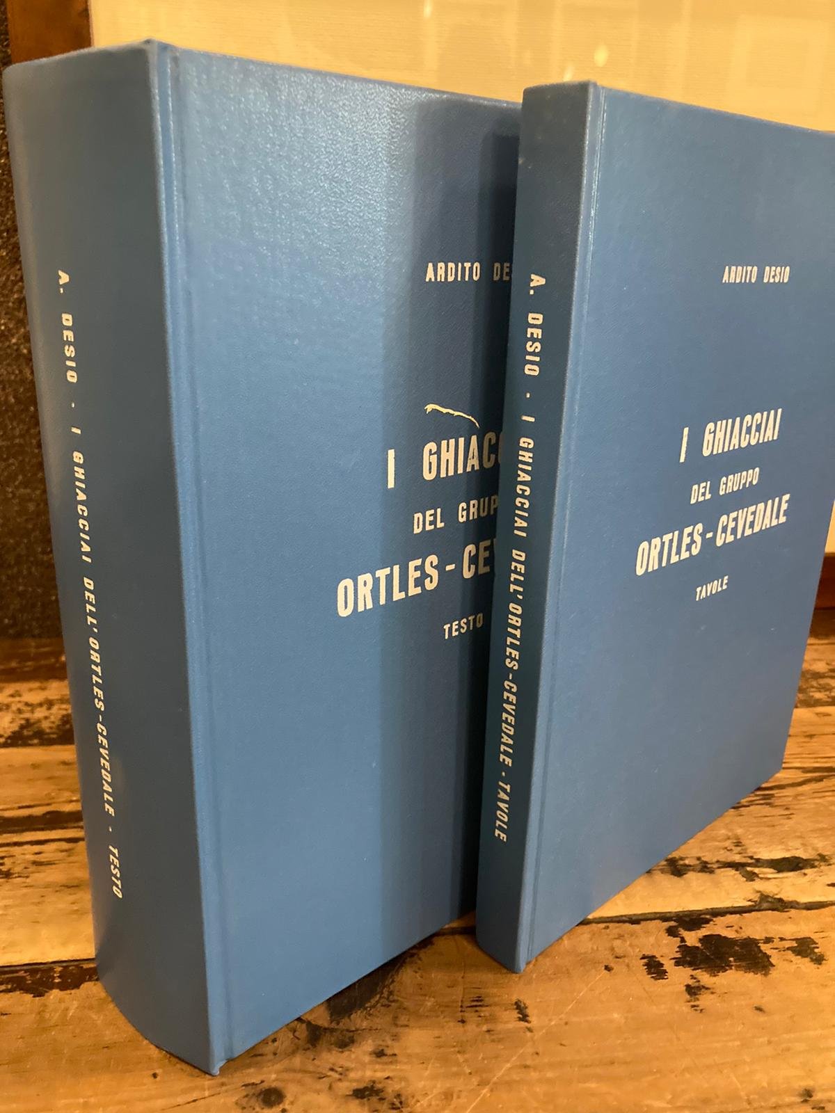 Due volumi in-4° (27x20 cm), legatura in balacron azzurro editoriale con titoli impressi in bianco ai dorsi e ai piatti anteriori. Pp. XXIV, 874, (2) di errata corrige, 129 figure; XXI, (1), 207 tavole fotografiche, una carta ripiegata nella tasca in fine. Stato di nuovo. Fondamentale lavoro di censimento scientifico dei 132 ghiacciai (inizio anni Sessanta) di uno dei soli tre gruppi montuosi alpini totalmente in territorio italiano (gli altri due il massiccio del Gran Paradiso nelle Alpi Graie e quello Adamello-Brenta nelle Alpi Retiche). L'operato di Ardito Desio (e di E. Feruglio per un breve periodo) fin dai primi anni venti fu di grande spirito pionieristico, come lo fu l'idea del Comitato Glaciologico italiano di intraprendere e sponsorizzare tale ricerca. Campagne glaciologiche annuali più o meno lunghe con posizionamento di segnali sui fronti dei ghiacciai e relativi rilevamenti di avanzamenti e ritirate furono intraprese dai primi anni venti fino agli anni sessanta, con esclusione dei soli anni della seconda guerra mondiale. I dati, le ricerche, le deduzioni di Desio sono state riveduti, corretti, aggiornati anche con ricerche sul campo da Severino Belloni e Augusto Giorgelli. L'opera è un prezioso documento non solo storico, ma anche metolodologico, in quanto interfacciandosi direttamente con l'altro testo di riferimento - Catasto dei ghiacciai italiani (1961) - riesce a fare il punto sulla situazione morfologica dei bacini glaciali, sulla loro copertura, sulle loro variazioni (e relative influenze sui corsi d'acqua) e sul limite climatico delle nevi perenni. Muovendo infatti da ricostruzioni storiche e geografiche, si procede col censimento descrittivo e si conclude con le parte teorico deduttiva. Repertorio cartografico e iconografico di prim'ordine per dettaglio e precisione: esempio esemplare la cartina più volte ripiegata con posizione delle fronti dei ghiacciai dal 1865 al 1961 con distribuzione dei cordoni morenici (compilata da Belloni).