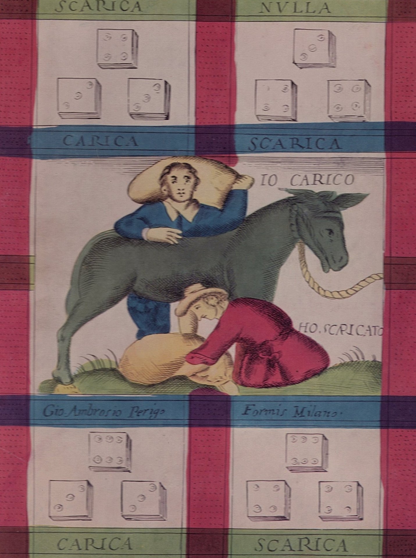 In-4°, pp. di testo 94 + XXXI, (1) di bibliografia, circa 130 tavole sciolte a colori o in b.n., ripiegate più volte ed impresse sia al recto che al verso, accompagnate da legende esplicative. Le tavole riproducono con tecnica zincografica una ricchissima iconografia antica (incisioni, disegni, grida e bandi, etc.) sui più svariati giochi di dadi e d'azzardo. Numerose altre tavole in b.n. n.t. Testo e tavole sono conservate entro una legatura editoriale a mo' di libro scatola in tela bicolore marrone e beige con illustrazione in b.n. al piatto riproducente un antico gioco dell'oca. Conservata la custodia editoriale con bordi in tela marrone e piatti in cartone figurato a colori con riproduzioni di antiche stampe di giochi. Minimi difetti agli angoli aperti superiori del cofanetto. Lieve brunitura al piatto anteriore. Buon esemplare. Elegante monografia riccamente illustrata sui giochi di dadi e d'azzardo (zara, tre dadi, pari e dispari, krabs, gioco del sette, quinquenove, passadieci, etc.). Prefazione di Caterina Santoro. 'Una raccolta di curiosita' storiche e politiche ove si alternano tavole con intenzioni occulte altre palesi, a tavole con un preciso tema o personaggio, a tavole rivoluzionarie, a tavole argute.' (dalla presentazione). I testi sono attinti all'Encyclopédie' di Diderot e D'Alembert. Collana I numeri grandi, 1,