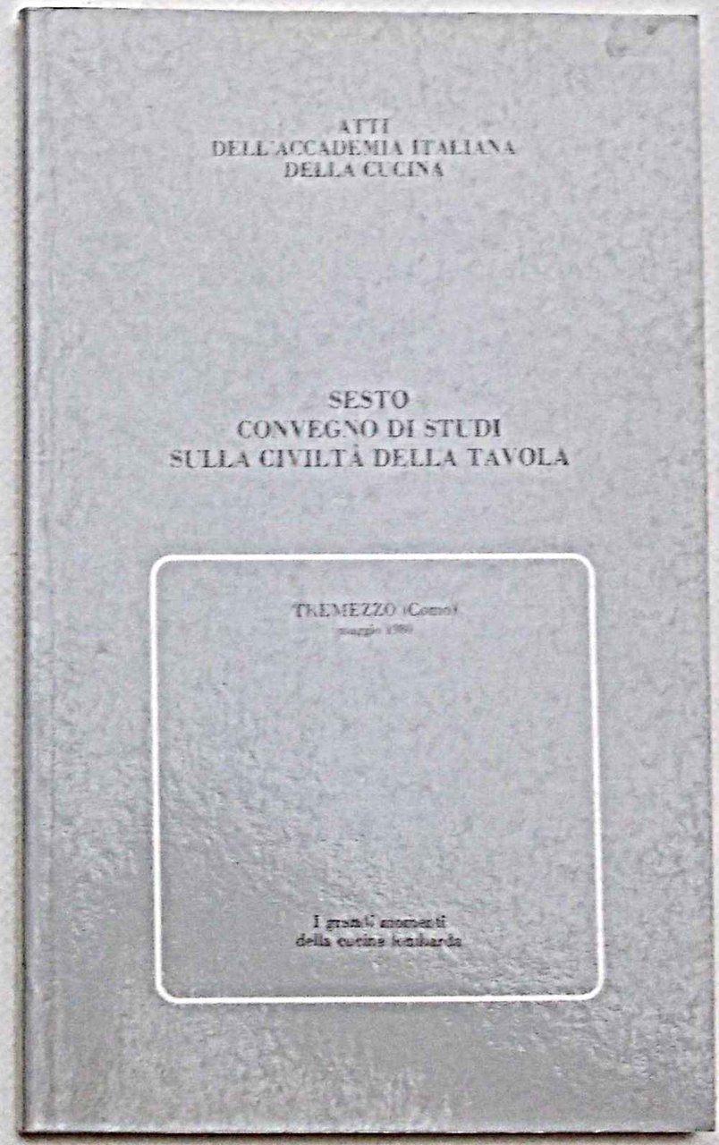 In 8° stretto (cm. 22,5 x 13,5); pagine 141; leggera cartonatura originale. VG. ** Atti del Sesto Convegno di Studi sulla Civiltà della Tavola di Tremezzo (CO). Presentazione di M. Alberini. Contiene, tra l'altro: l'ufficio della mensa di Corte dai Visconti a Ludovico il Moro; il "tesoro delle paludi": il riso in Italia; fonti lombarde della cucina italiana del Rinascimento; vini di Lombardia: le origini; storia dell'alimentazione della gente Lombarda e Ticinese; la cucina Napoleonica; a pranzo col "Giovin Signore".