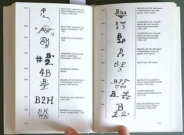 Vol. in -8 (12,5 x 19,5 cm.), legatura editoriale telata bianca, sopracopertia sempre bianca con illustr. a colori e titoli in nero sul piatto ant., pp. 255, (1) con moltissimi marchi di ceramiche in nero nel testo. In buone condizioni.