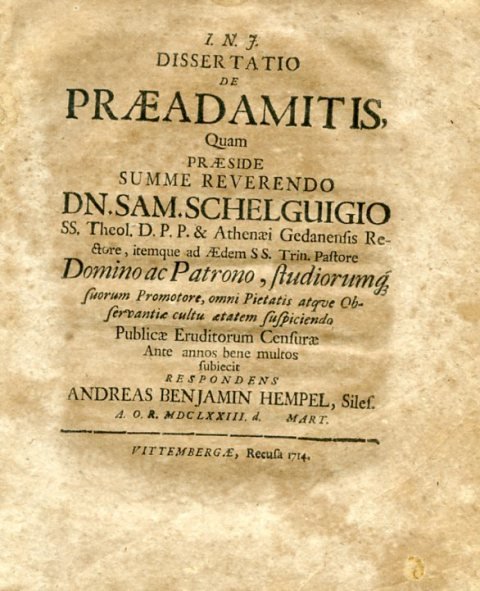 I. N. J. Dissertatio de Praeadamitis, quam Praeside Summe Reverendo D. N. Sam. Schelguigio SS. Theol. D. P. P. & Athenaei Gedanensis Rectore. respondens Andreas Benjamin Hempel