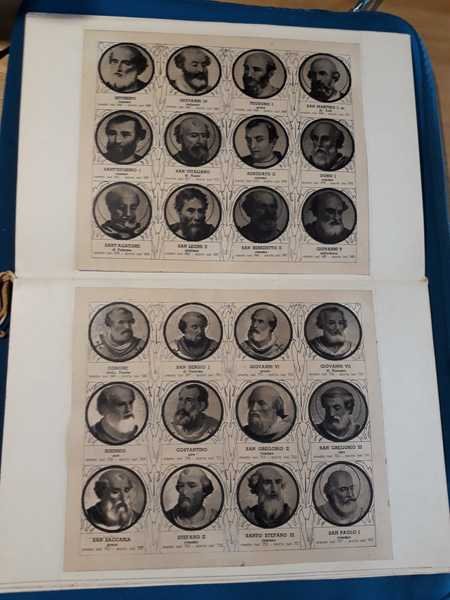 In 4° piccolo, collezione di 21 tavole applicate su cartoncino con la collezione dei pontefici da san Pietro a Pio XII. Cartonato.
