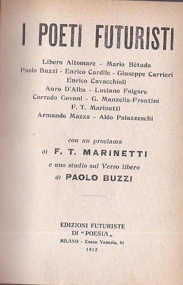I poeti futuristi. Libero Altomare - Mario Bètuda - Paolo Buzzi - Enrico Cardile - Giuseppe Carrieri - Enrico Cavacchioli - Auro D'Alba - Luciano Folgore - Corrado Govoni - G. Manzella Frontini - F. T. Marinetti - Armando Mazza - Aldo Palazzeschi. Con un proclama di F. T. Marinetti e uno studio sul Verso libero di Paolo Buzzi