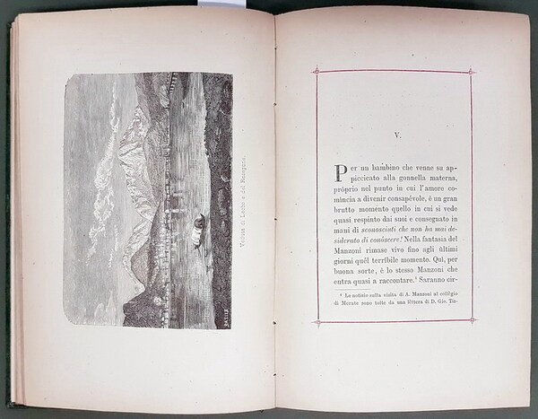 Vol. in -8 (13,5 x 19,3 cm.), legatura originale telata verde con titoli incisi in oro sul piatto e al dorso, fogli riquadrati in rosso, pp. (4), 1 ritratto in b.n. in atiporta di A, Manzoni, 253, (3), 10 incisioni in nero a p.pagina, 1 lettera in fac-simile più volte ripiegata. Copertina un pò scolorita, frontespizio con mancanza riparata (senza perdita del testo), dedica del vecchio proprietario datata 1905. nel complesso in abb. buone condizioni (integro e ben legato).