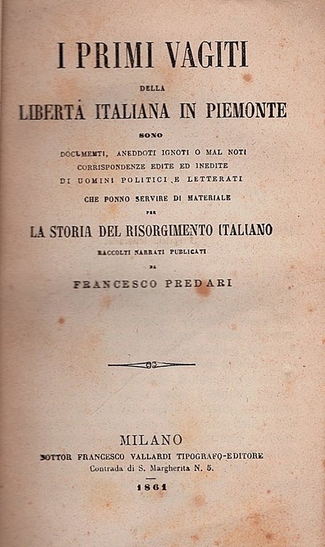 I primi vagiti della libertà italiana in Piemonte sono documenti, aneddoti ignoti o mal noti, corrispondenze edite ed inedite di uomini politici e letterati che ponno servire di materiale per la storia del Risorgimento italiano raccolti, narrati.
