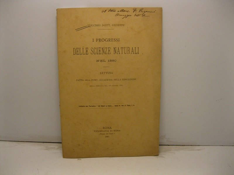 I progressi delle scienze naturali nel 1880. Lettura fatta alla Pont. Accademia della Concezione nella tornata del 18 giugno 1881. Estratto dal periodico 'Gli Studi in Italia', anno IV, vol. II, fasc. I. II.