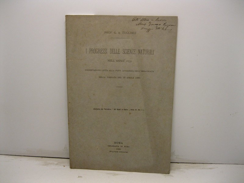I progressi delle scienze naturali nell'anno 1879. Dissertazione letta alla Pont. Accademia dell'Immaclata nella tornata del 29 aprile 1880. Estratto dal periodico 'Gli Studi in Italia', anno III, vol. I