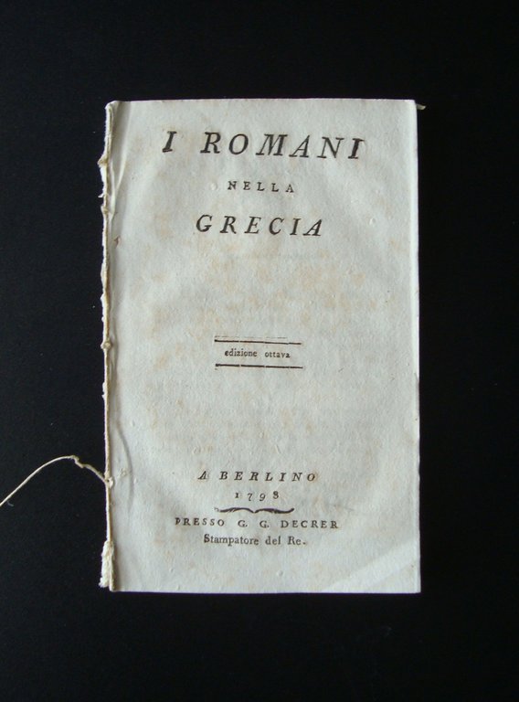 Opuscolo, I Romani nella Grecia edizione ottava Berlino, 1798, cm 17,5x11, pp. 54; brossura ed. in italiano. Condizioni di conservazione. Esemplare in buono stato con leggere tracce d'uso e del tempo, prima e ultima di copertina mancanti, dorso con abrasioni e piccole mancanze, qualche piccola macchietta. OPEB.4150 BLU