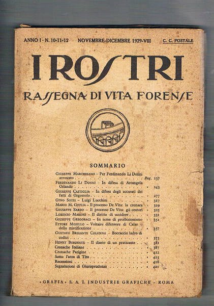 I rostri rassegna di vita forense n° 10-12 del 1929. Marchesano per Ferdinando Li Donni avvocato, Castigliola in difesa degli accusati di Orgosolo, Maroni il diritto di uccidere, Voltaire difensore di Calas o della demistificazione, Brigante Colonna Boccaccio ladro di codici, ecc.