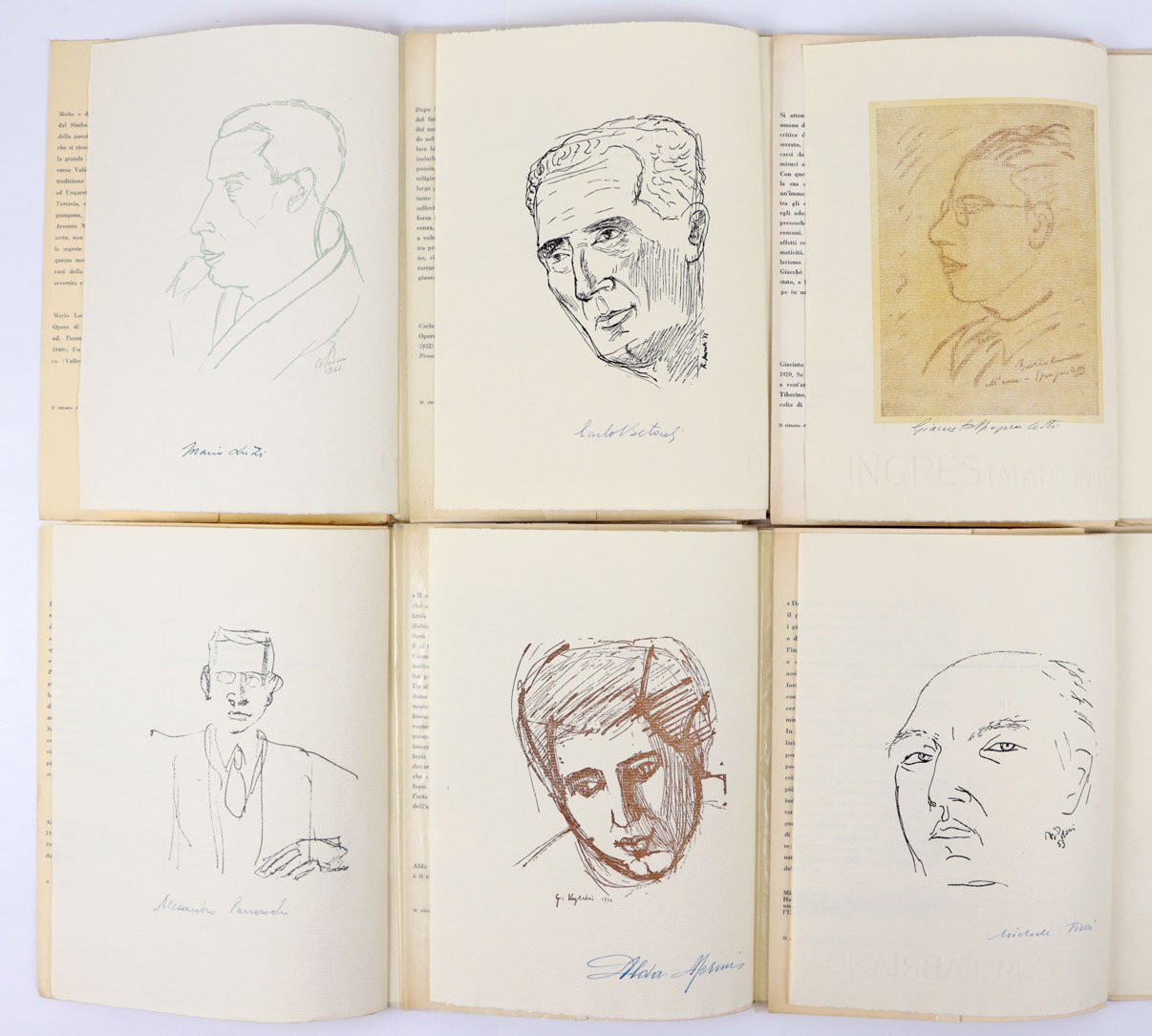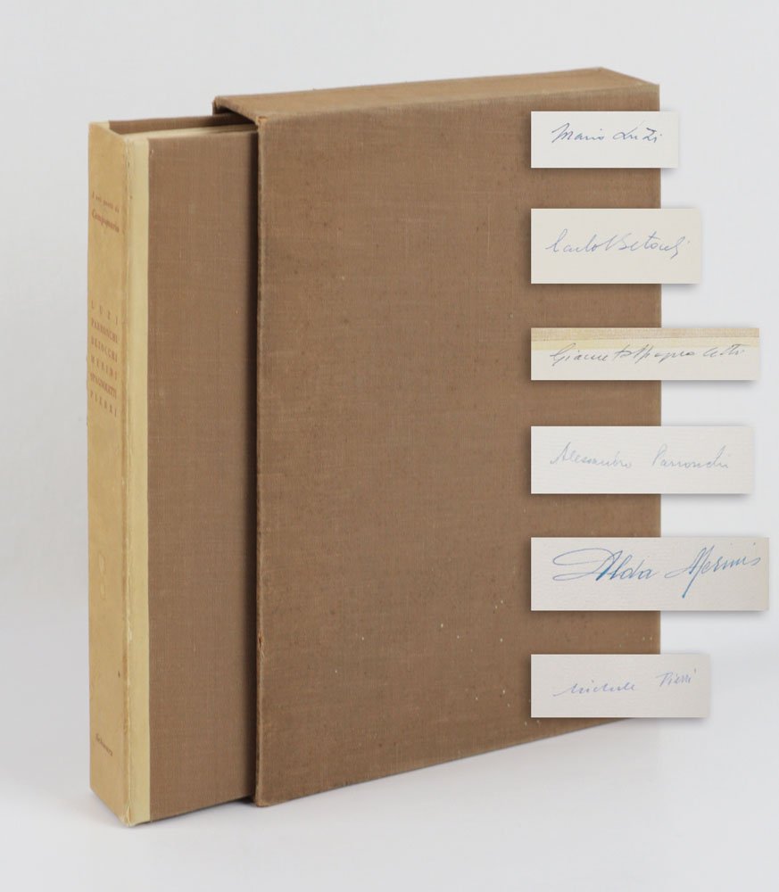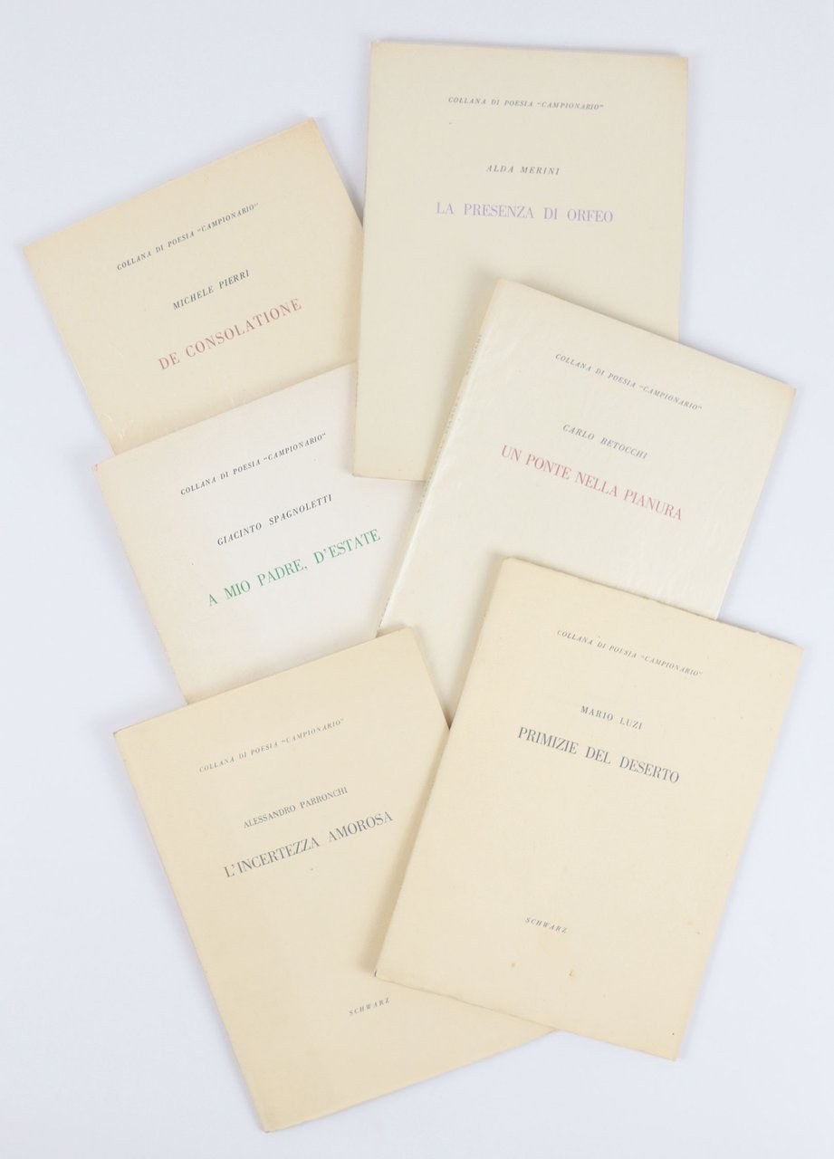 LIBROEdizioni originali in tiratura di testa nella rarissima emissione con cofanetto editoriale.CON AUTOGRAFO.Serie completa degli esemplari numero 2/50 di ciascun volume, tutti in ottime condizioni (tre completi del raro pergamino protettivo originale: Betocchi, Merini e PIerro) e tutti firmati dagli autori alla pagina del ritratto; cofanetto conservato in maniera eccellenteRaccolta in cofanetto di sei dei primi sette volumi della collana «Campionario» nella tiratura di testa di soli 50 esemplari numerati e firmati dagli autori, stampati su carta Ingres di Fabriano (il terzo quaderno, «Un grido e paesaggi» di Ungaretti, dapprima annunciato con il titolo di «Monologhetto», uscì in formato più grande e non fu qui raccolto): «Primizie del deserto» di Mario Luzi (con un ritratto dell’autore di Ottone Rosai), «L’incertezza amorosa» di Alessandro Parronchi (ritratto da Mario Marcucci), «Un ponte nella pianura» di Carlo Betocchi (ritratto da Rolando Monti), «La presenza di Orfeo» di Alda Merini (ritratta da Giustino Vaglieri), «A mio padre, d’estate» di Giacinto Spagnoletti (ritratto da Luigi Bartolini) e «De Consolatione» di Michele Pierri (ritratto da Miriam Pierri). Le tirature di testa dei volumi di «Campionario» si distinguono per la rarità, la carta di pregio, per i colori dei titoli in copertina, diversi da un volume all’altro (ad eccezione dei primi due titoli) e soprattutto per la presenza dell’autografo dell’autore. -- I volumi furono pubblicati tra il 1952 e il 1953, quando la libreria di Arturo Schwarz era ancora un punto di ritrovo di letterati e intellettuali e non ancora l’iconica galleria d’arte in cui si sarebbe trasformata nel 1961, crocevia dei più noti artisti avanguardisti del Novecento. Vengono qui pubblicate le raccolte d’esordio di Alda Merini e di Michele Pierri e la seconda raccolta di Giacinto Spagnoletti (direttore della collana, che ancora giovane si era già fatto un nome come curatore e critico), mentre gli altri poeti erano già molto affermati: come si deduce dai risvolti di copertina di «Primizie del deserto» e dell’«Incertezza amorosa», Schwarz aveva progetti molto ambiziosi per la sua collana, che prevedeva anche testi di Alfonso Gatto (il cui posto fu poi preso dalla «Presenza di Orfeo» di Alda Merini), Vittorio Sereni, Attilio Bertolucci, Giorgio Caproni «e altri». -- Il primo volume di «Campionario», «Primizie del deserto», apparve a novembre 1952; l'ultimo, «De Consolatione», apparve ad aprile 1953, con annuncio al risvolto di copertina di altri due volumi nella collana, «Sciarada» di Gatto (che non fu mai pubblicato) e «Ombre» di Bartolini (che fu pubblicato come «Ombre sulle metope», primo volume dell’altra collana poetica di Schwarz, «Dialoghi con il poeta»). -- I contatti tra l’editore e Spagnoletti erano iniziati quando Schwarz (nato nel 1924 ad Alessandria d’Egitto ed espulso come trotzkista) ancora non era arrivato a Milano nel 1949. Intenzionato a inaugurare una collana di poesia, fu Spagnoletti a suggerire per primi i nomi di Luzi e dell'allora diciottenne Merini. L’attività editoriale prese avvio nell’aprile 1952 e proseguì frenetica fino al 1959, pubblicando autori come André Breton, Benjamin Péret, Leo Trotsky, Raffaele Carrieri, Elio Pagliarani, Salvatore Quasimodo e Tristan Sauvage, pseudonimo sotto cui si celava lo stesso editore Schwarz.