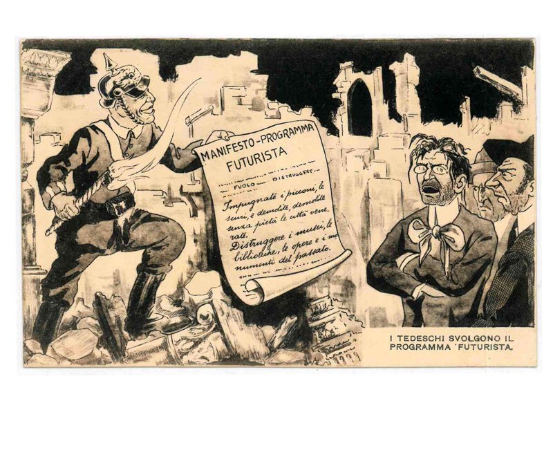 EPHEMERAEdizione originale.Ottimo esemplare.Cartolina parodica che inscena un soldato tedesco mentre svolge, sullo sfondo di ruderi, un foglio con il «MANIFESTO-PROGRAMMA FUTURISTA» osservato da tre volti arcigni in cui forse l’anonimo bozzettista ha voluto rappresentare i lacerbiani Papini e Soffici.