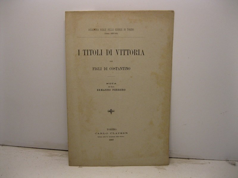 In 8, pp. 7 + (1b). Br. ed. Estratto dagli Atti della R. Accademia delle Scienze di Torino, vol. XXXIII. Saggio relativo alle iscrizioni, tre in tutto, nelle quali al nome dei figli di Costantino seguono i titoli di vittoria.