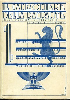 In-16°, pp. 63, brossura editoriale illustrata in azzurro da Mossello Roietto. Illustrazioni in b.n. n.t. Ex-libris di Cesare Maria de Vecchi di Val Cismon ed etichetta della sua biblioteca. Ottimo stato. Raccolta di inni, canti e canzoni di esaltazione militare e fascista pubblicato a cura della I^ Legione Milizia Universitaria Principe di Piemonte.