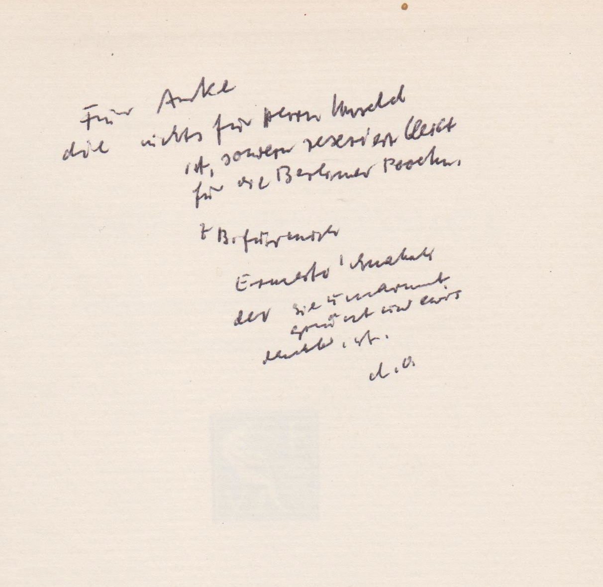 7.-10. Tausend. Mit einer persönlichen Widmung und Signatur des Autors auf dem Vorsatz. - "Für Anke / die nichts für Herrn Unseld ist, sondern reserviert bleibt für die Berliner Poeten, z.B. für mich Ernsto Schnabel."