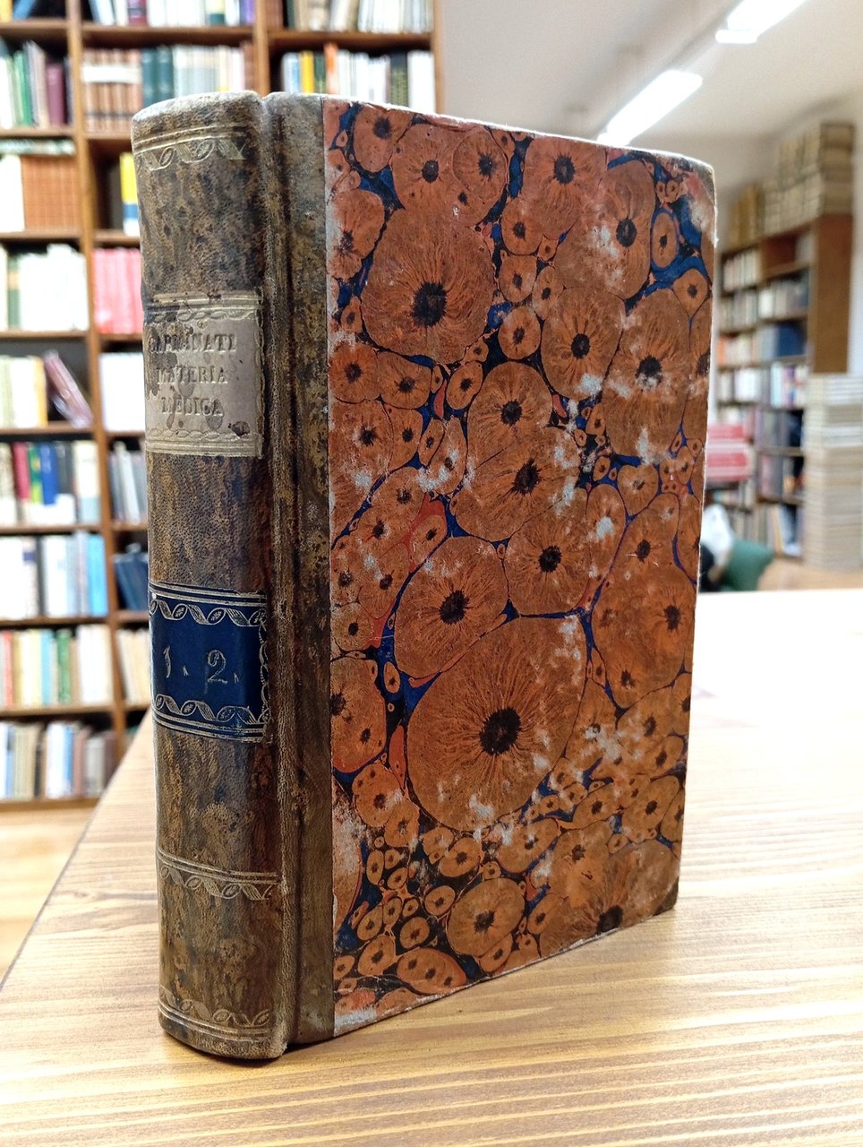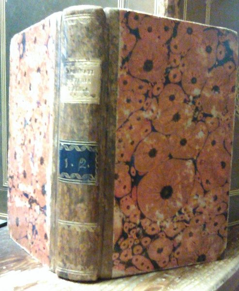 "Igiene terapeutica e materia medica del professore Carminati tradotte e compendiate dal dott. F. Enrico Acerbi con note sue, e dell'autore, e col prospetto della nuova dottrina de' medicamenti secondo la teoria del contro-stimolo" - Opera in due tomi rilegata in un unico volume, 218 + 187 pagine; legatura coeva in mezza pelle, piatti marmorizzati, titolo e fregi oro al dorso. Traduzione di Enrico Acerbi. Fioriture e bruniture alle carte, ma esemplare fruibile in ogni sua parte e complessivamente ben conservato.
