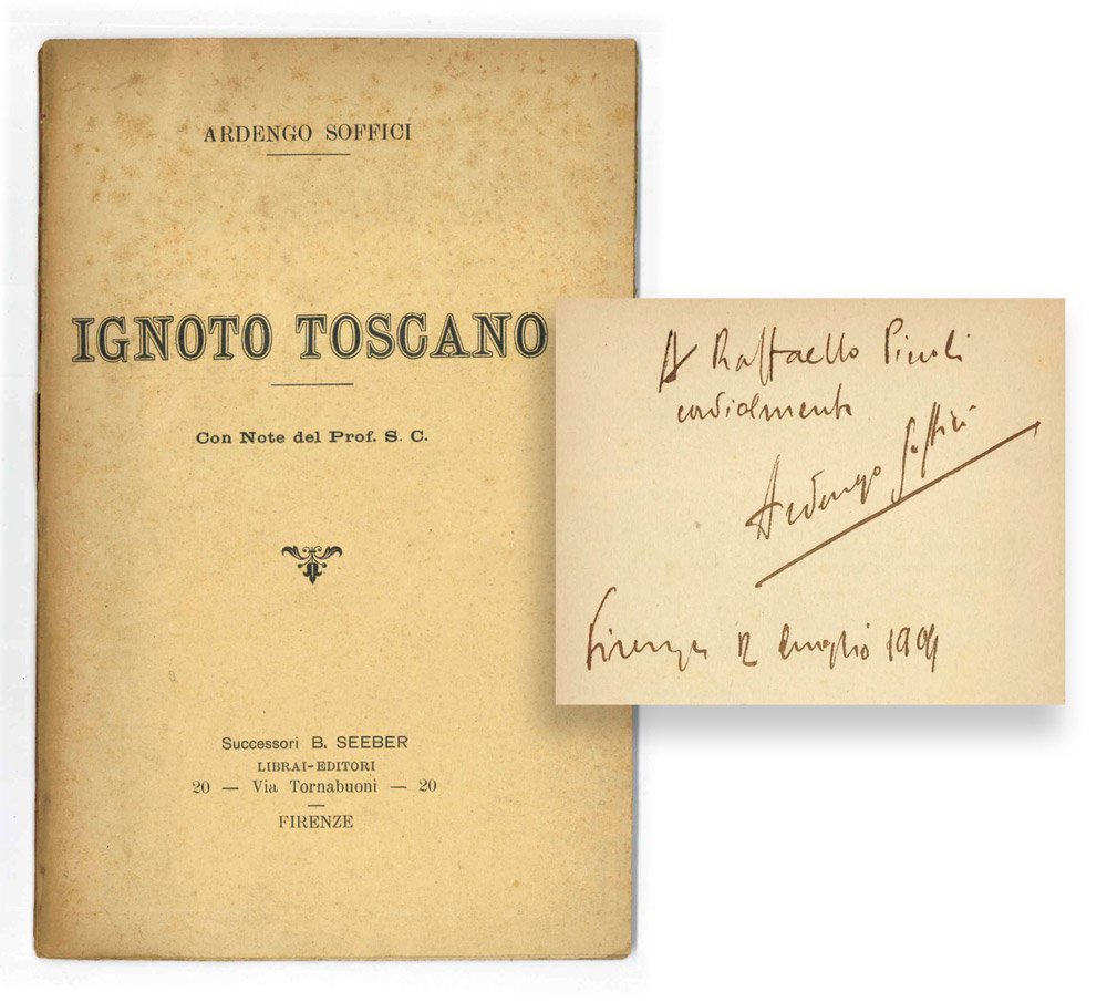 LIBRO Edizione originale. CON AUTOGRAFO. Straordinario esemplare: la copia di Raffaele Piccoli (Napoli 1886 - Davos 1932), intellettuale crociano, poeta simbolista e traduttore dall’inglese, fu Serena Professor of Italian all’università di Cambridge, dove strinse amicizia con i colleghi Piero Sraffa e Ludwigi Wittgenstein (L. Morra, Piero Sraffa and Raffaello Piccoli: Two Italian Scholars in Cambridge 1929-1932, Centro Sraffa Working Papers n. 44, august 2020, online); nel 1909 Piccoli collaborava al «Leonardo» e alla «Voce», da cui la conoscenza con Soffici che gli invia l’«Ignoto Toscano» accompagnato dalla dedica autografa strettamente coeva «A Raffaello Piccoli cordialmente Ardengo Soffici — Firenze 12 luglio 1909» (ringraziamo Domenico Cammarota per le informazioni). In più che buone condizioni di conservazione, quasi ottime, con la normale brunitura più accentuata ai piatti della copertina, l’anteriore fiorito e con distacco fermato alla cerniera anteriore. Rarissimo esordio in prosa di Ardengo Soffici pubblicato nel 1909 dai “Successori di B. Seeber, librai-editori in Firenze”, per i cui tipi sarebbe apparso nello stesso 1909 «Il caso Medardo Rosso». Stampato a spese dell’autore (cfr. Gambetti-Vezzosi, p. 873), parte dell’invenduto venne successivamente riemesso con il timbro “Libreria della Voce” al piatto anteriore. Composto a partire dal 1907 – anno del ritorno del pittore, poeta e scrittore in Toscana (tra Firenze e Poggio a Caiano) dopo il quadriennio parigino e dell’inizio della collaborazione con «La Voce» di Prezzolini e Papini – con i titoli provvisori «Tragedia» e poi «Figure Allegre sul Fondo Nero», il libretto vide infine la luce con il nome di «Ignoto Toscano». Aperto dalla dedicatoria di ispirazione foscoliana e leopardiana — «Alle anime di Didimo Chierico, Filippo Ottonieri e Diogene Tevfelsdröckh con riverenza di discepolo e amore di fratello» — il racconto si presenta come una lunga lettera inviata al fittizio professore-editore “Prof S.C.”, presentato in copertina come curatore delle note, per raccontare la breve vita di un giovane artista toscano, incontrato dall’autore poco tempo prima a Parigi. Attraverso tale artificio letterario sono le posizioni filosofico-estetiche della prima fase sofficiana a emergere, quelle moderniste e parzialmente nietzschiane, con la figura dell’artista intesa come genio capace di cogliere le verità profonde della natura per rivelarle attraverso le sue opere. -- Riedito nel 1947 all’interno della collezione Garzanti «Opera prima» in tiratura limitata a 200 esemplari, una ristampa anastatica di «Ignoto Toscano» (250 copie fuori commercio) è comparsa nel 2010 grazie all’Associazione culturale Ardengo Soffici di Poggio a Caiano.