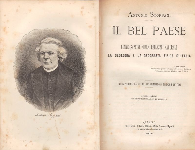 In-8°, legatura coeva in mezza pelle con titoli e rotelle in oro al dorso liscio; pp. Con ritratto dell'autore in antiporta, e numerose incisioni xilografiche intercalate nel testo. Abrasioni alla pelle della legatura, e fessura alla cerniera interna del piatto anteriore; macchia al margine delle pp. da 127 a 130; rare leggere fioriture. Nel complesso buon esemplare. Antonio STOPPANI (Lecco, 1824 - Milano, 1891), è stato geologo, paleontologo, patriota e presbitero italiano; è considerato il padre della geologia mondiale.