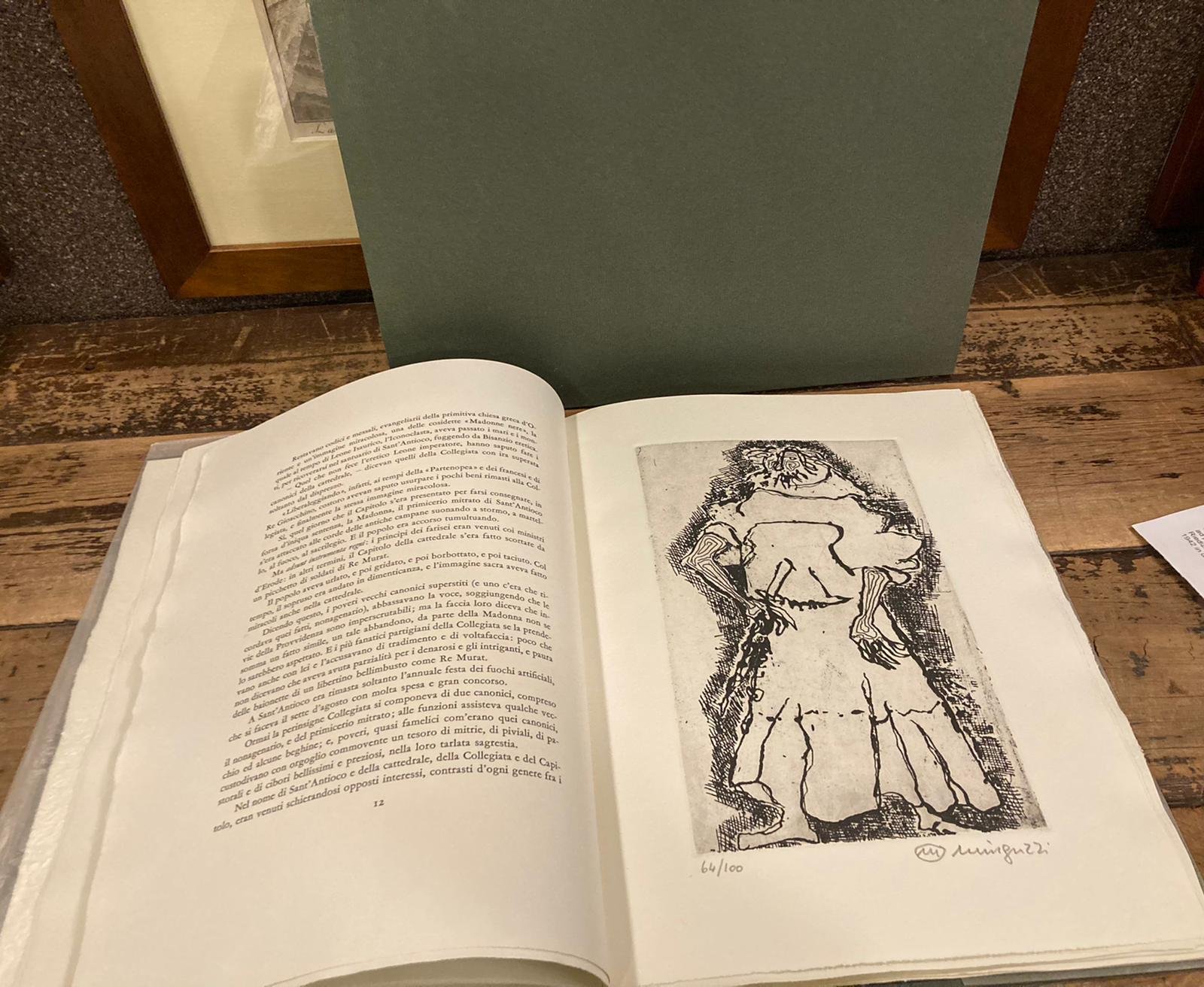 In-4° (34x26 cm), cartonatura editoriale rigida verde con titoli su tasselli cartacei al dorso e al piatto anteriore, velina protettiva (difetti), astuccio in cartoncino muto verde. Pp. 45, (3), 5 tavole fuori testo di incisioni protette da veline. Più che buon esemplare in barbe (N° 64/130) stampati ad personam su carta tino Magnani. Riedizione di squisita fattura tipografica e iconografica del racconto uscito originariamente nel 1942 in una raccolta eponima. A cura dei Cento amici del libro.