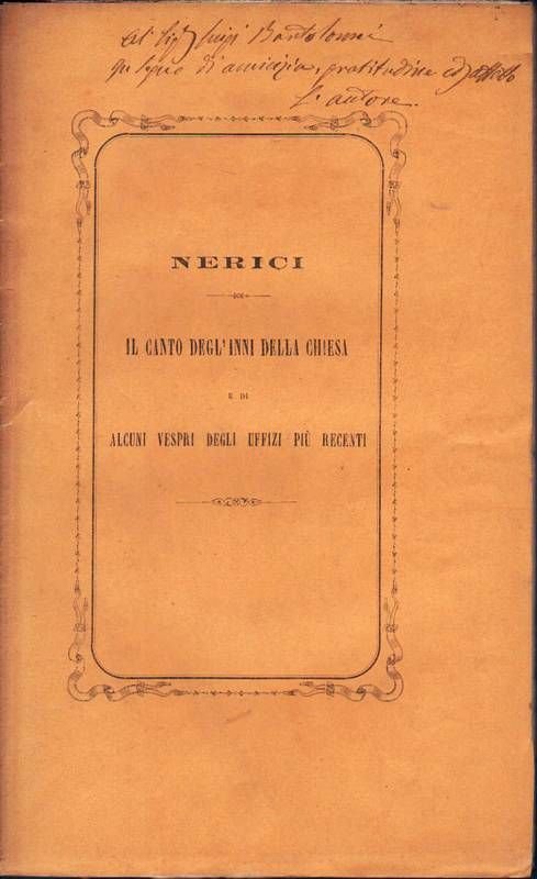 In-8°, in brossura editoriale con titoli in nero in cornice tipografica ai piatti; pp. 110(2). Al margine sup. della prima di copertina dedica autografa firmata 'L'autore'. L'abate Luigi NERICI (Lucca, 1822 - 1902), autore del trattato, fu musicista compositore e insegnante di musica nel Seminario Arcivescovile di Lucca e in quello Decanale di S. Michele; fu inoltre il primo insegnante di Giacomi Puccini; del 1879 è la sua opera principale, la Storia della Musica in Lucca (nelle Memorie e documenti, Lucca, Bertini). Buon esemplare, abbastanza fresco e impreziosito dalla dedica dell'autore.