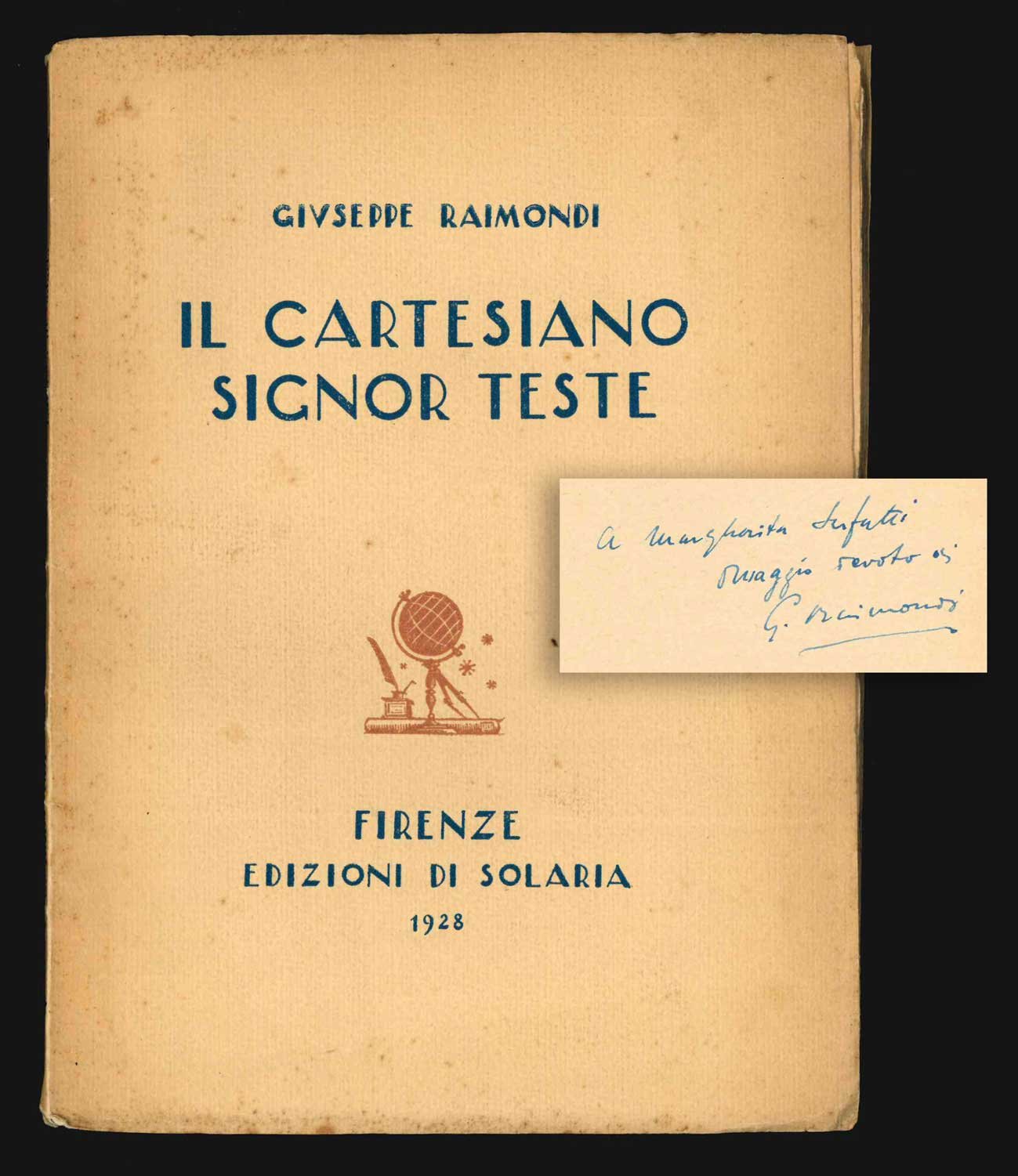 LIBROEdizione originale.CON AUTOGRAFO.Eccezionale esemplare: la copia numero 3 di 420, appartenuta a Margherita Sarfatti, con dedica autografa dell’autore in «omaggio devoto».Brillante operetta a metà tra il saggio e l’esercizio letterario, dedicata al Valéry di «La soirée avec monsieur Teste». Inusualmente per le edizioni di «Solaria», la copertina presenta un design a due colori impreziosito da una piccola illustrazione, non firmata ma di Bruno Bramanti, pare non gradita all’autore — da cui l’esistenza di copie con la classica grafica di copertina «Solaria». Fu Raimondi, naturalmente, a volere il disegno di Leo Longanesi stampato in antiporta e raffigurante il «Colloquio notturno del Signor Edmondo Teste e di Renato Cartesio».