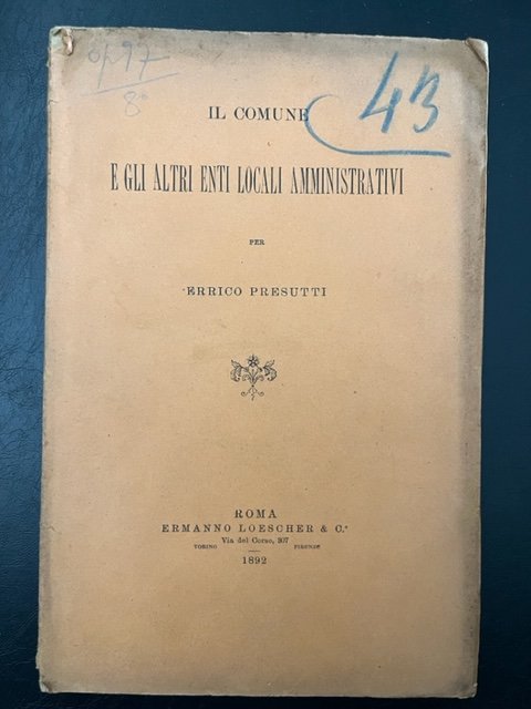 In 8 (cm 16 x 24,5), pp. 85 + (3 bianche). Pagine intonse. Brossura editoriale. Estratto editoriale da "Rivista Italiana per le Scienze Giuridiche". Uno dei primi studi di diritto amministrativo di Errico Presutti, all'epoca ventiduenne. Fu professore di Diritto amministrativo e di Diritto costituzionale a Napoli fino all'avvento del fascismo, poi dichiarato decaduto dalla Cattedra universitaria per essersi rifiutato di prestare giuramento di fedelta' al regime. Fu sindaco di Napoli nel 1917 e deputato per due legislature nel 1921 e nel 1926. Si schiero' co l'opposizione aventiniana dopo il delitto Matteotti. Rientro' nella vita accademica solo nel 1946. Appartenente alla Massoneria, mori' nel 1949.