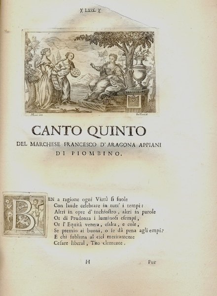 In fol., cm 42, p. pelle, pp. CXXXIV + 9 inc. di Mussi e Terni poste all'inizio di ogni canto. Antip. con pregevolissima inc. di Ferrari e Perfetti. Capilettera. Al front. è stata ritagliata la marca tipografica. Ampi marg. Carta forte. Tagli marmorizzati. Fregi in o. al d. Mende al d. medesimo ed ai piatti. Lievi gore. Stupendo libro di feste, uno degli esemplari in carta grande, da ritenersi uno dei più bei figurati piacentini. Ogni canto è composto da un nobile locale: Marchese Baldini, Conte Carasi, Conte Scotti di S. Giorgio, Conte Scribani Rossi, Marchese Appiani, Conte Scotti di Sarmato, Marchese Lando, Abate Maggi,