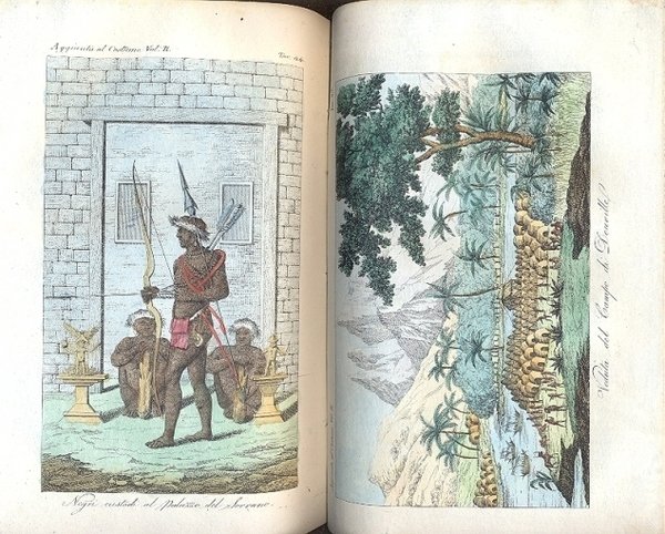 29 tomi su 34 volumi, in 8°, mezza pelle, ogni volume è di ca. 400 pagine. L'opera è così suddivisa: 10 tomi su 15 volumi di Europa , 862 incisioni , e 5 tabelle più volte ripiegate. Risultano mancanti le seguenti incisioni; vol. 2°: 49, 61, 62, 63, 83, 101 - vol. 3°: 114, 115, 116, 129, 139 e 139 bis - vol. 10°: 9 e 29. - 8 volumi Asia , 500 incisioni, nel 4° vol. manca l'inc. n. 66. 4 volumi Africa, 159 inc. Nel primo vol. risulta mancante l'inc. n. 3. Il 4° vol. è privo dell'inc. n. 52. 4 volumi America, 173 inc. Nel 2° vol. manca l'inc. n. 38, mentre nel 3° la n. 25. 3 voll. di Aggiunte, 184 inc. La pag. 189 , del 1° vol., presenta un errore di stampa che lede le prime lettere delle16 righe iniziali, nello stesso vol. sono mancanti le inc. n. 16 (Cina) e n. 37 (Palestina). Nel 2° vol., sono mancanti le inc. n. 8, 24, 25 e 34 (primo gruppo) e 4, 5 e 7 (Egitto). Quasi tutte le inc. sono a colorii, e molte più volte ripiegate. Mende alle copp. Alcune pag.sciolte. Gore su alcuni voll. Gli anni di edizione non sono continui. Qualche inc. è stata inserita capovolta.