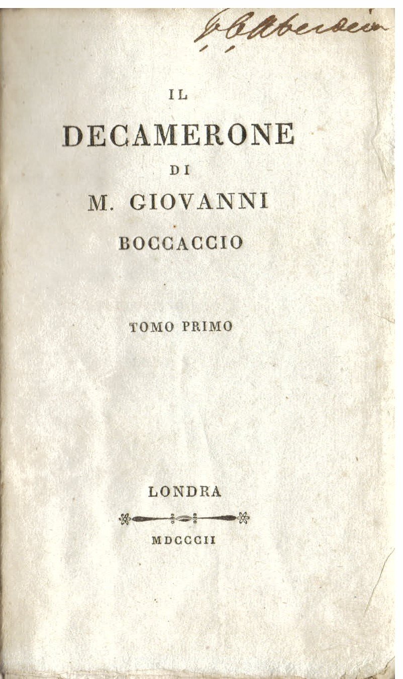 4 volumi in-8° (175x105mm), pp. XXIII, 304, (2); 409, (5); 324, (2); 309, (3); brossura originale muta. Nutrito indice in fine dell'ultimo vol. Firme di possesso ottocentesche. Bella copia in barbe e intonsa, stampata su carta cerulea. Edizione ottocentesca con falso luogo di Londra (ma impressa dal Gamba di Livorno), preceduta da una vita del Boccaccio di Filippo Villani. Parenti, Dizionario dei luoghi di stampa falsi, p. 127. Bacchi della Lega, p. 54: 'Nitida edizione, secondonchè annota il Papanti, sconosciuta ai bibliografi, in carta cerulea, colla vita del Boccaccio scritta dal Villani, e coll'Indice delle voci antiche, oscure, ecc. compilato dall'Ab. Malanima'.