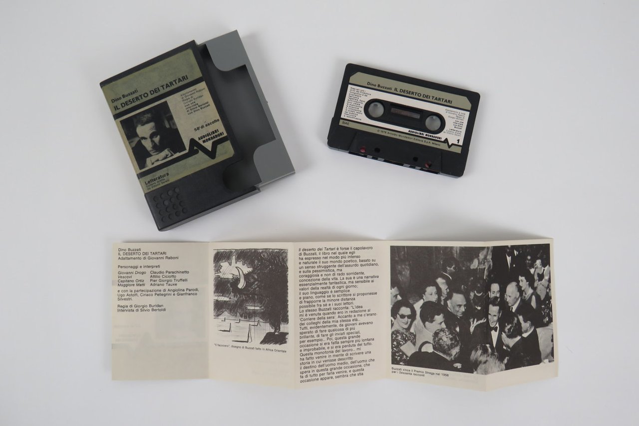 LIBROPrima edizione di questo adattamento.Ottimo esemplare completo dell’astuccio e del piccolo pieghevole allegato. Adattamento del romanzo di Buzzati della durata di 58 minuti con regia di Giorgio Buridan. Interpreti Claudio Parachinetto come Giovanni Drogo, Attilio Ciciotto come i Vescovi, Pier Giorgio Truffelli come il Capitano Ortiz e Adriano Tauxe come il Maggiore Matti; con la partecipazione di Angiolina Parodi, Ugo Astolfi, Ciriaco Pellegrini e Gianfranco Silvestri. Chiude la cassetta un’intervista a Buzzati rilasciata a Silvio Bertoldi poco prima della sua morte.