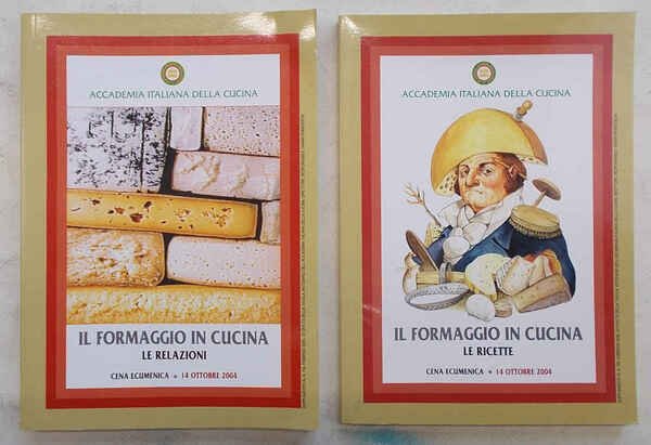 Due volumi in 8° (cm. 21 x 15); pagine 124 - 112; con alcune illustrazioni in nero; copertina originale in cartoncino semirigido lucida a colori. VG. ** Edizione fuori commercio riservata ai soci dell'Accademia Italiana della Cucina. Il primo volume "Le ricette" contiene oltre 100 ricette. Il secondo volume "Le relazioni" contiene: Alba, Le tome della Langa - Altamura, il canestrato pugliese - Aosta, fontina e oltre - Avellino, il pecorino camasciano - Belluno, le ricotte di malga - Ciriè, la toma di Lanzo. - Civitavecchia, il pecorino romano - Cosenza, il caciocavallo della Sila - Messina, la provola dei Nebrodi - Napoli, i formaggi bufalini- Ogliastra, il pecorino sardo - Padova, la formaggella padovana - Sorrento, il provolone del monaco.