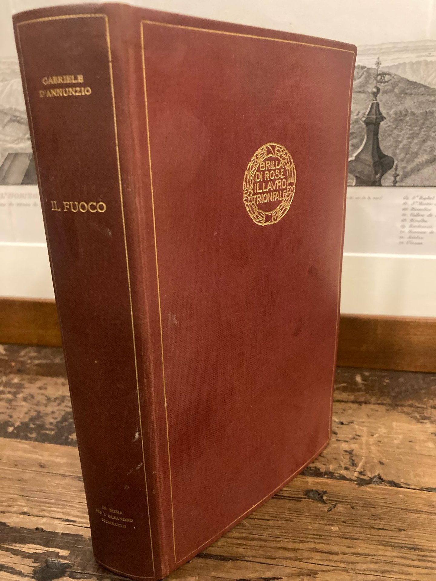 In-8° (20x12 cm), pp. (6) 519 (3), tela editoriale cremisi con titoli al dorso e impresa dannunziana dorati con motto al piatto anteriore. Più che buon esemplare. Ristampa per i tipi dell' Oleandro del romanzo del vate edito in princeps nel 1900 (ma composto nel 1898). Il romanzo di ambientazione crepuscolare è ambientato nella Venezia del 1882 nel tempo della morte di Wagner. Doveva essere il primo della trilogia I romanzi del melagrano ma rimase l'unico edito.