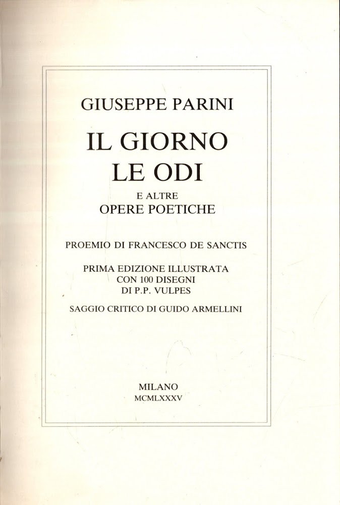 Il volume è un edizione originale, per la prima volta illustrata, del poemetto "Il giorno" delle odi e di altre rime scelte di Giuseppe Parini.