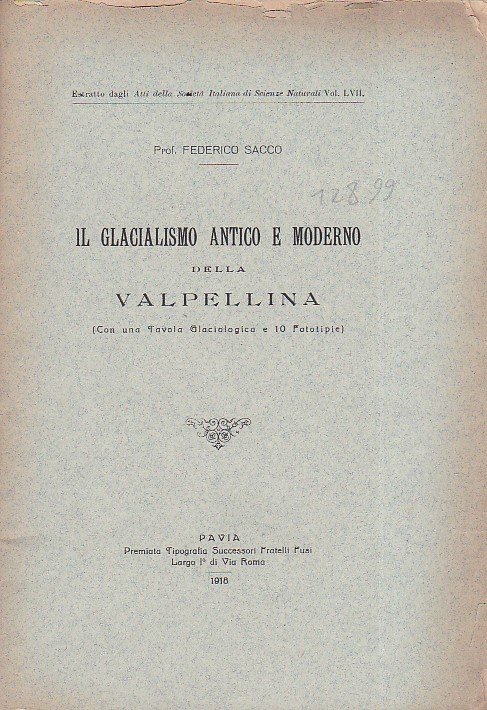 In-8°, pp. 28, brossura editoriale. Una carta a colori in fine e una tav. fototipica ripiegata in fine con 10 figure di ghiaccia valpellinesi. Ingialliture lievi. Estratto dagli 'Atti della Società Italiana di Scienze Naturali', vol. LVII.
