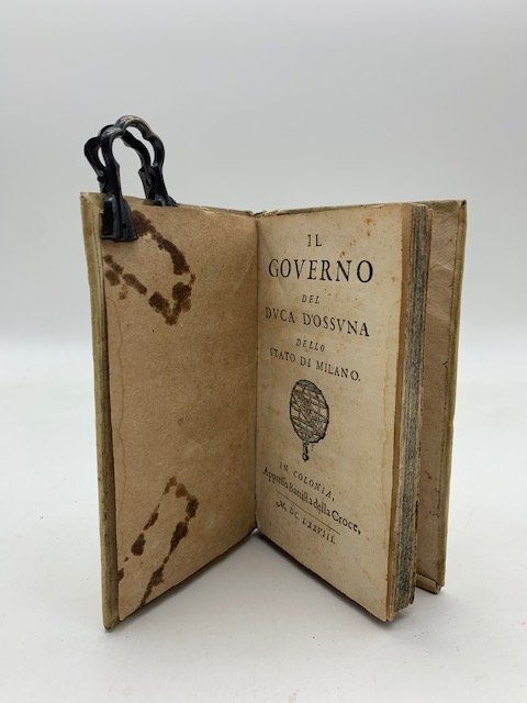 In 24 (cm 8 x 14), pp. (6) + 123 + (1 bianca). Pagina 67 erroneamente numerata 69, esemplare completo. Sguardie iniziale e finale con segni di vecchio nastro adesivo. Legatura coeva in piena pergamena. Edizione originale (Piantanida negli "Autori italiani del '600", v. 1, p. 188, cita l'edizione del 1678 come edizione originale sotto falsa data ed in effetti risultano altri esemplari della stessa opera con data 1677, quindi anche questa del 1678 e' in realta' ascrivibile al 1677) stampata a Ginevra, ma con falso luogo di stampa Colonia pubblicata anonima e attribuita Attribuito a Girolamo Arconati Lamberti (Michel, Repertoire des ouvrages imprimes en langue italienne au 17 siecle conserves dans les bibbliotheques de France, v. 1, p. 64 e v. 5, p. 38). L'opera fu per certo tempo attribuita a Gregorio Leti ma poi smentita da F. Barcia in "Bibliografia delle opere di Gregorio Leti" ed e' il racconto, dal 1670 al 1673, del governatorato a Milano dell'operato del Duca di Osuna. "La natura spregiudicata, virulenta e vivacemente polemica del testo.induce a considerare con cautela l'attendibilita' delle notizie riportate, nonostante l'autore affermi di non aver raccontato 'cosa benche' minima che non sia verissima" ("La scena della gloria. Drammaturgia e spettacolo a Milano in eta' spagnola, 1995, p. 331). Lozzi, I, 2645.