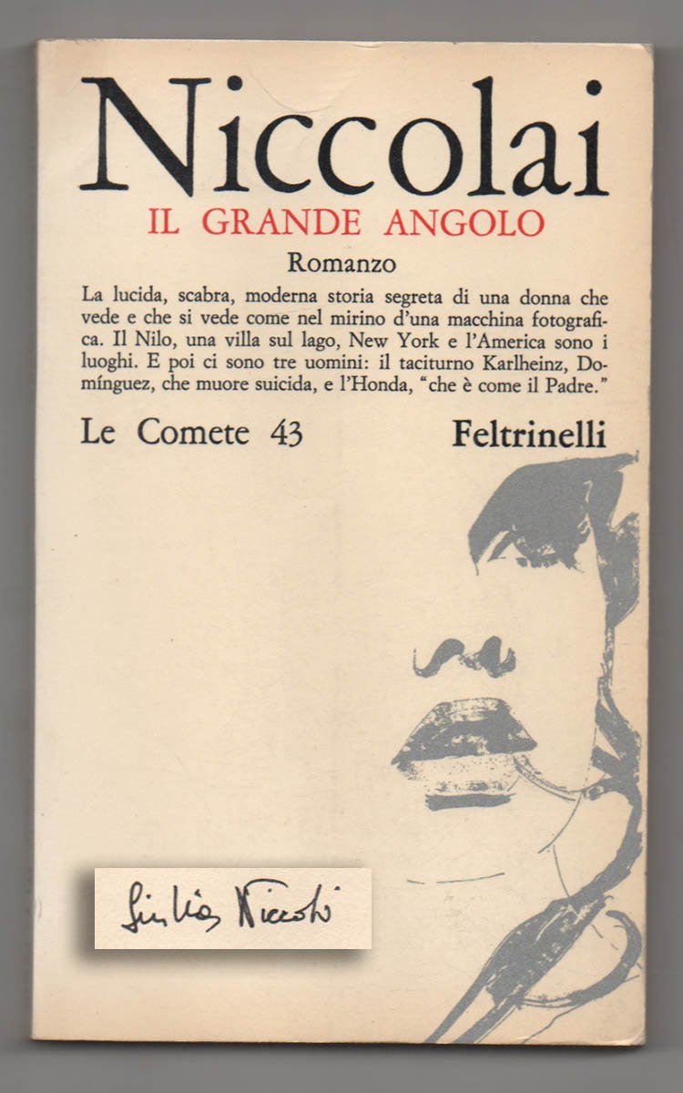 LIBROPrima edizione.CON AUTOGRAFO.Ottimo esemplare pregiato dalla firma autografa dell’autrice al frontespizio. Conserva scheda bibliografica editoriale.Fotogiornalista prima di irrompere sulla scena della neovanguardia e della sperimentazione come poetessa, scrittrice e saggista, Giulia Niccolai mette a frutto il suo passato - nonché le influenze presenti dettate dal “Nouveau Roman” e dall’“école du regard” - in questo suo primo romanzo, edito da Feltrinelli nel 1966. «Il grande angolo» è un’opera in cui il mezzo fotografico si fa metafora del nostro modo sempre mediato di entrare in relazione con l’ambiente circostante e con il nostro mondo interiore, nonché con l’immagine fatalmente distorta, mai del tutto fedele e nitida, che ne ricaviamo. Ormai raro nella prima edizione qui presentata, il libro è stato ripubblicato da Oèdipus nel 2014 con una significativa nota dell’autrice: «Comunque, questo mio esageratamente lungo ripensamento sul “Grande angolo” del 1966, mi fa pensare che anche un testo così casualmente concepito, privo di vere basi tecniche, immaturo e ingenuo, scritto per le ragioni più sbagliate – che ho già menzionato – abbia finito per l’avere un vero senso. È stato uno di quei passi maldestri che abbiamo osato fare e che ora, da vecchi, assommati ad altre migliaia di capriole, slogature, salti con l’asta e cadute danno un senso e ci fanno sentire in pace con la nostra esistenza. Tout se tient!»