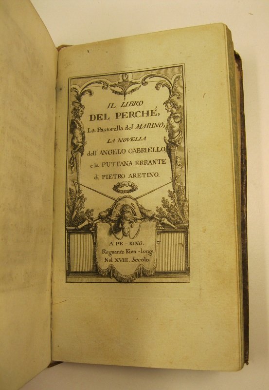 In 16, pp. (2) + 168. Legatura in piena pelle. L'opera e' legata insieme a In morte di Ugo Bass-Ville di Vincenzo Monti (Mantova, 1798), di pagine 216. Segue l'opera Il libro del perche', di pp. 168, stampato su carta azzurrina. Graziosa edizione stampata a Londra per conto dei Molini nel 1784 in 200 copie. Celebre raccolta di scritti libertini con echi classicheggianti e mirabolanti invenzioni lubriche. Parenti, Diz. falsi luoghi, p. 167. Graesse, V, 197. Brunet, IV, 488.