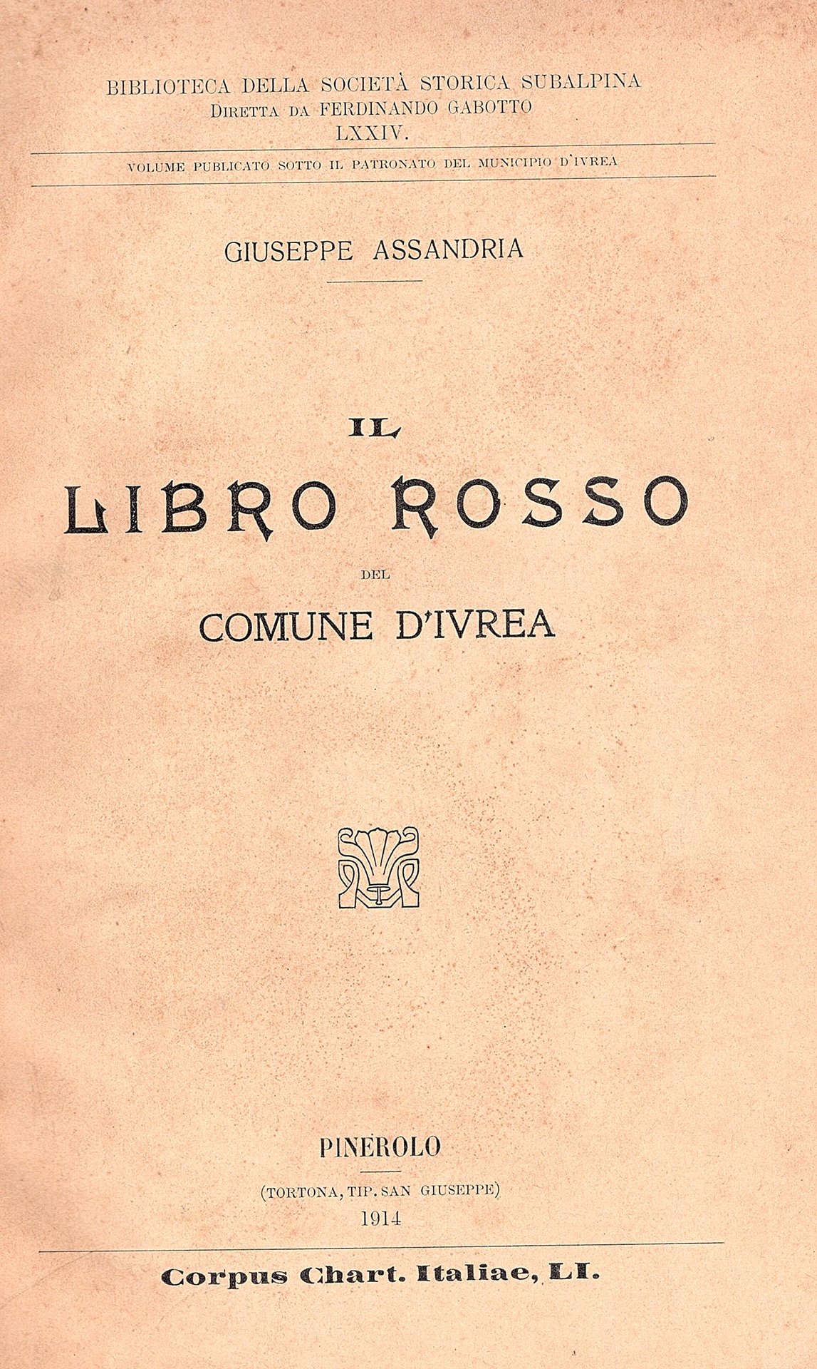 In-8°, pp. IX, 380, (1), brossura editoriale. Ampi indici in fine. Dorso rinforzato Prima edizione, edita sotto il patronato del Municipio di Ivrea, di un codice di fondamentale importanza per la conoscenza dell'antica storia eporediese del XII e XIII secolo, detto anche 'Il libro delle frecce', allora conservato presso la famiglia San Martino di Germano. L'introduzione contiene un'ampia descrizione fisica del manoscritto. Biblioteca della Società Storica Subalpina diretta da Ferdinando Gabotto, LXXIV. Corpus Chart. Italiae, LI.