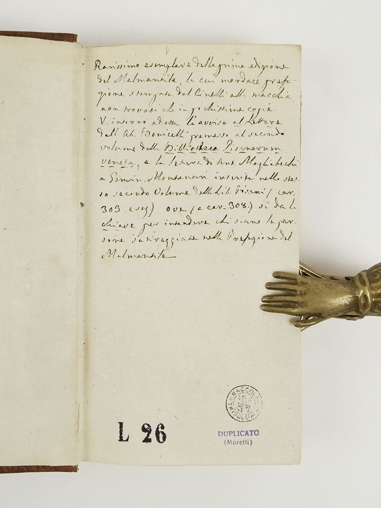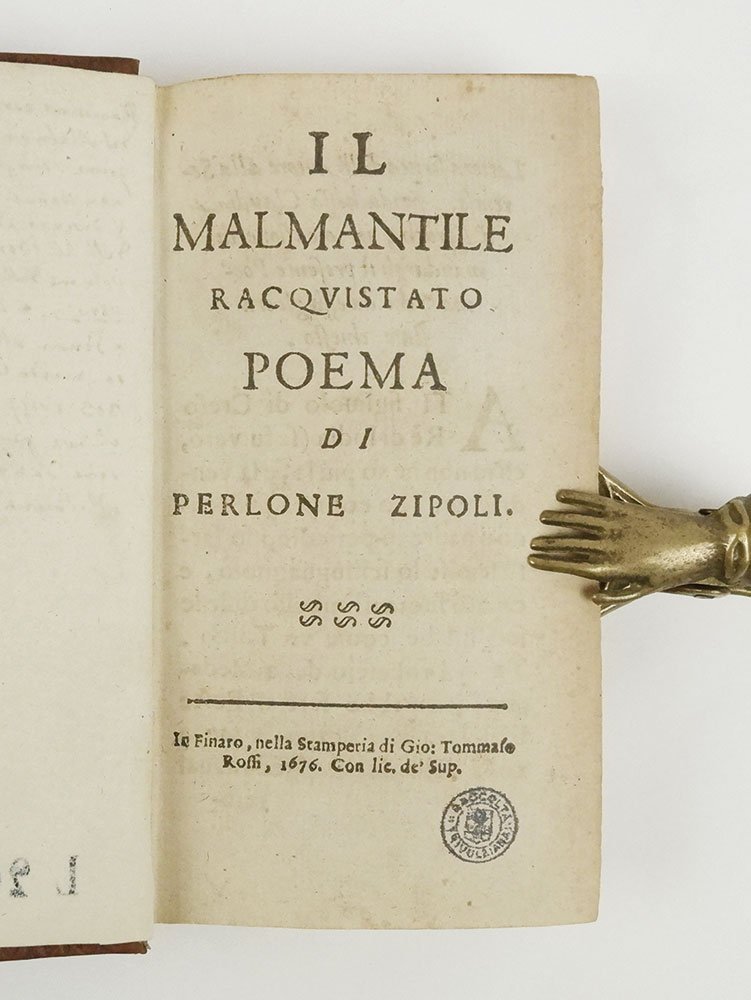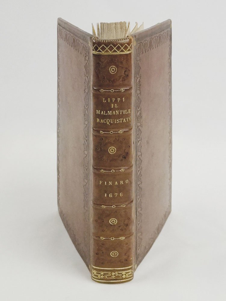 LIBROPrima edizione.Ottimo esemplare, uno dei soli 50 (cfr. Parenti, «Luoghi di stampa», p. 86) che contiene la prefazione del curatore Cinelli «Al cortese lettore» (cc. 16), che si scaglia con ardore contro numerosi letterati del suo tempo. Timbretti passim «Raccolta Trivulziana» (con la dicitura “duplicato”): la biblioteca, come noto, alienò i doppi della sua raccolta negli anni Sessanta; alla seconda sguardia, in grafia ottocentesca, viene descritta la vicenda editoriale con la chiave di lettura della prefazione.Rarissima editio princeps del celebre poema «Il Malmantile racquistato», burlesca parodia della «Liberata» di Tasso, scritto dal pittore fiorentino Lorenzo Lippi (1606-1665), uscito postumo con l'anagramma Perlone Zipoli. Avventurose le vicende che portarono a questa prima pubblicazione: l’opera era a lungo circolata in forma manoscritta, ottenendo un grande favore tra i lettori. E tuttavia Lippi, preoccupato che i suoi versi potessero offendere amici e conoscenti, per quanto citati con nomi fittizi, si era sempre opposto alla pubblicazione. «Dopo la sua morte Leopoldo de' Medici incaricò Minucci di approntare una pubblicazione commentata dell’opera, così che questa fosse comprensibile anche fuori Firenze. Ma fu più lesto il medico G. Cinelli Calvoli «infaticabile e spiantato scrittore-editore, il quale annusò l'affare e tentò una pubblicazione già nel 1672» (C. D'Afflitto-C. Carminati, «Dizionario biografico degli italiani», s.v. «Lippi, Lorenzo»). Avendo incontrato però numerosi ostacoli ed essendosi visto negare l’approvazione alla stampa (anche per la strenua opposizione mossa da Minucci, che voleva pubblicare per primo l’opera), Cinelli si risolse a stampare “alla macchia”: «Egli chiese all'Aprosio di trovare uno stampatore prestanome, o addirittura uno stampatore da poco deceduto: si trovò infine Giovanni Tommaso Rossi del Finale, presso il quale, con falso luogo di stampa, vide la luce la prima edizione (Il Malmantile racquistato poema di Perlone Zipoli, In Finaro 1676, ma la data è da intendersi ab Incarnatione e il libro uscì di fatto nel gennaio 1677) [.]. Il Cinelli intese aggiungervi una pungentissima prefazione "Al cortese lettore" ripiena di allusioni trasparenti al Minucci e ai suoi: ma essa fu intercettata dalla censura e sopravvisse in pochissimi esemplari» (C. D'Afflitto - C. Carminati, «Dizionario biografico degli italiani», s.v. Lippi, Lorenzo). Tra questi, Bibl. Parenti, Luoghi di stampa, p. 86 con l'indicazione di tiratura ridotta; Gamba, Olschki (Choix, «très rare»).