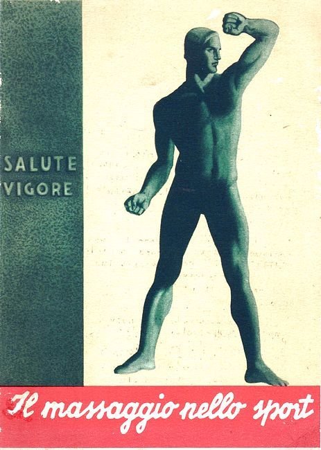 Opuscolo In-8°, legatura in brossura rigida illustratta a colori, pp.16 e una tavola fuori testo piegata, dove si illustrano le articolazioni e la muscolatura del corpo umano. All'interno delle legatura, le pubblicità a colori dei prodotti per i massaggi. Nel testo figure di vari sport e guida ai vari massaggi adatti ad ognuno di essi. Alla basa di pagina 7, un pronunciamento del Duce:- 'Il Duce si esprime chiaramente contro la Paccottiglia di prodotti stranieri'. Marginali tracce d'uso.