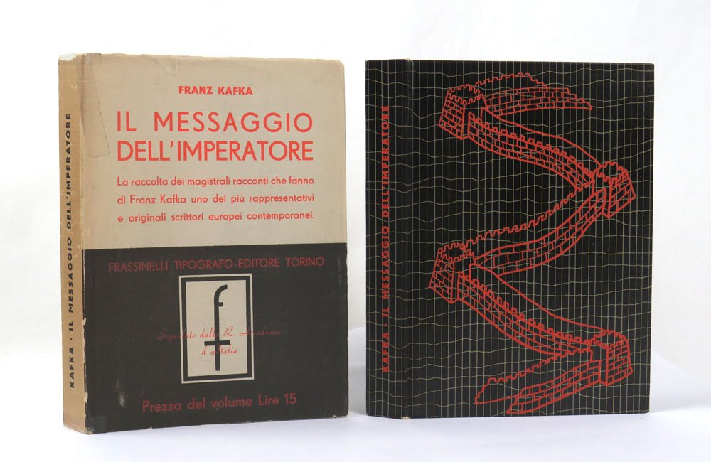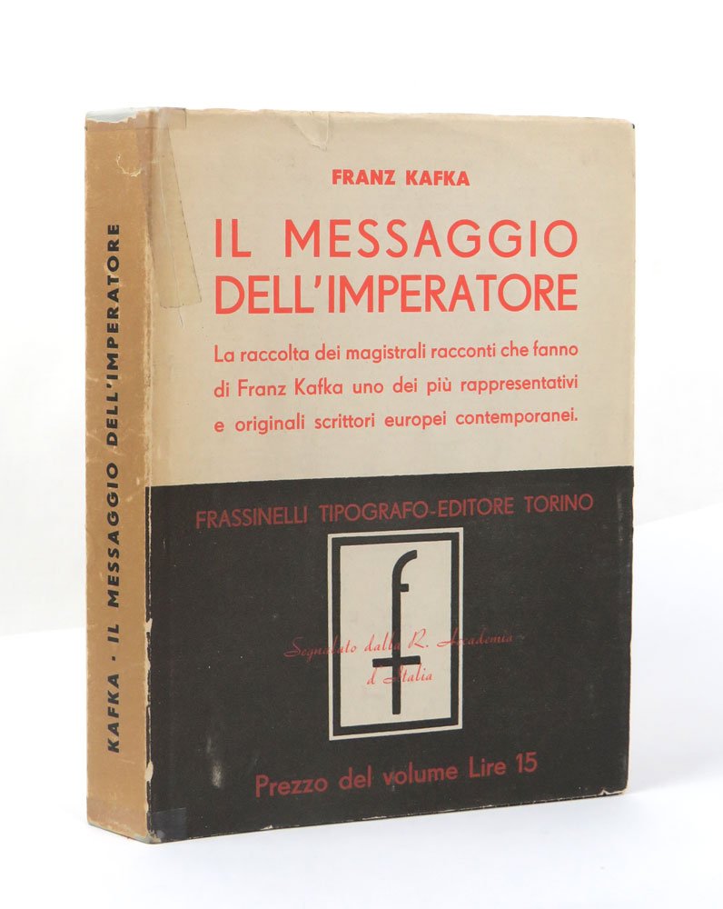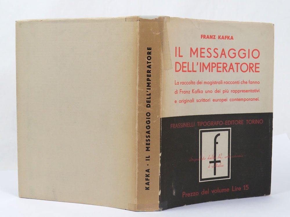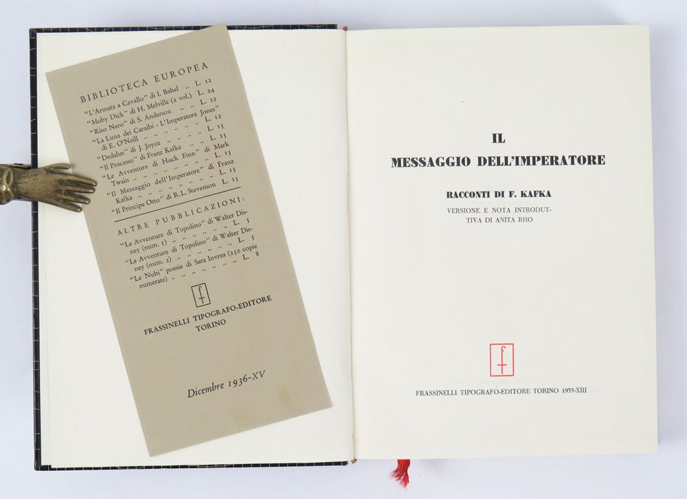 LIBROPrima edizione italiana.Ottimo esemplare completo della rarissima sovracoperta (nastro adesivo a testa e piede del dorso, leggermente brunito) e del segnalibro editoriale con il catalogo della «Biblioteca europea» Frassinelli datato dicembre 1936.Libro raro, rarissimo a trovarsi completo della sovracoperta. Prima raccolta di racconti apparsa in italia, si propone come onnicomprensiva. In realtà, oltre alle «Indagini di un cane» e «Josephine» (dichiaratamente esclusi perché troppo lunghi), la raccolta tralascia anche per intero le «Meditazioni» (pubblicate per la prima volta in italiano nei ‘Racconti’ Longanesi 1953, traduzione di Henry Furst). Pubblica dunque: La condanna (Das Urteil, 1913), La metamorfosi (Die Verwandlung, 1915), Nella colonia penale (In der Strafkolonie, 1919), la raccolta «Un medico di campagna» (Ein Landarzt, 1919), la raccolta «Un digiunatore» (Ein Hungerkünstler, 1924) e una selezione di circa la metà dei racconti pubblicati postumi per la prima volta in «Durante la costruzione della muraglia cinese» (Beim Bau der chinesischen Mauer, 1931). -- Il titolo ebbe un discreto successo, riproposto in formato quasi identico nel 1946, quindi nel 1952 e ancora ristampato negli anni ’60, la raccolta è ancora oggi nel catalogo Adelphi (ultima edizione 2003).Caputo-Mayr & Herz, Franz Kafka Internationale Bibliographie, p. 35