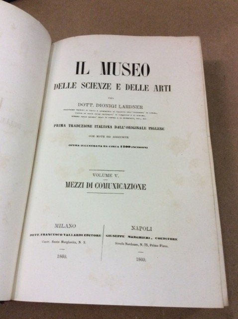 In-8, 6 volumi in 5 tomi, mezza pelle (abrasioni, un volume con dorso staccato), titolo oro al dorso, pp. XVI,711; 650; X,551; VIII,474; VIII,426,274.L'opera è così suddivisa: Volume 1: La terra sotto l'aspetto geografico, geologico e fisico. Volume 2: Il cielo. Nozioni astronomiche. Volume 3: Varietà di fisica. Volume 4: Varietà di meccanica e industria. Volume 5: Diversi mezzi di comunicazione. Volume 6: Varietà di storia naturale. Con lievi fioriture, peraltro ben conservato (slightly foxed, otherwise good condition).