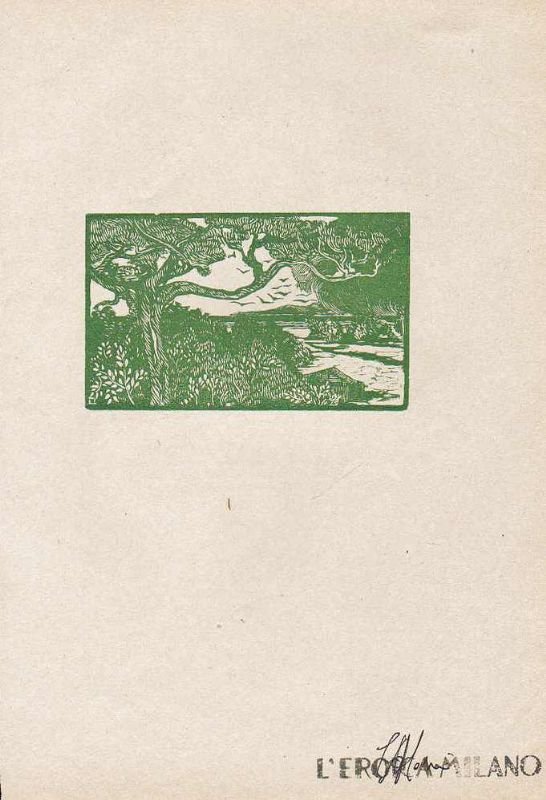 Foglio di cm 31,5 x 21,5 circa; l'immagine è stampata in inchiostro verde (cm 7,5 x 12). Prova di stampa della xilografia che andrà alla p. 19 del Quaderno 87-90 de L'Eroica, dedicato interamente a Giovanni Pascoli; al verso una prosa di Calogero Bonavia; nell'angolo in basso a destra timbro 'L'Eroica Milano' e firma del direttore della rivista, Ettore Cozzani. Ottimo stato di conservazione. Luisa LOVARINI iniziò lo studio della tecnica incisoria frequentando l'Accademia di belle arti di Bologna, studiando sotto la guida di Adolfo De Carolis. Nel 1939 venne assunta in Soprintendenza alle Antichità dell’EtruriaMeridionale (Roma II), dove operò soprattutto nell’ambito del rilievo e restauro di palazzi e monumenti antichi, per poi trasferirsi a Venezia e a Padova dove rimase fino al 1968. Non smise mai di dedicarsi all’attività artistica e continuò la sua attività di progettazione di interni fino agli anni ‘50 (da raccoltastampesartori.it).