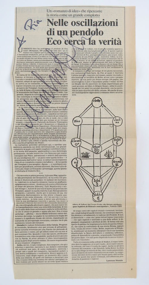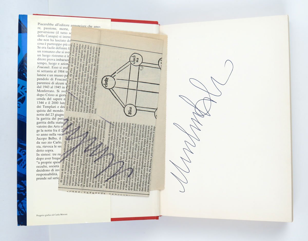 LIBROPrima edizione, prima tiratura.Ottimo esemplare (piccolo strappetto alla testa del dorso della sovracoperta; lieve gora alla sguardia anteriore; tagli normalmente bruniti).Il secondo romanzo di Umberto Eco è un complesso pastiche letterario in forma narrativa, che spazia largamente lungo l’arco delle scienze occulte e pseudo-scienze — il campo prediletto dall’Eco collezionista e divertito raccoglitore.Contursi, Eco Bibliography, n. A027a