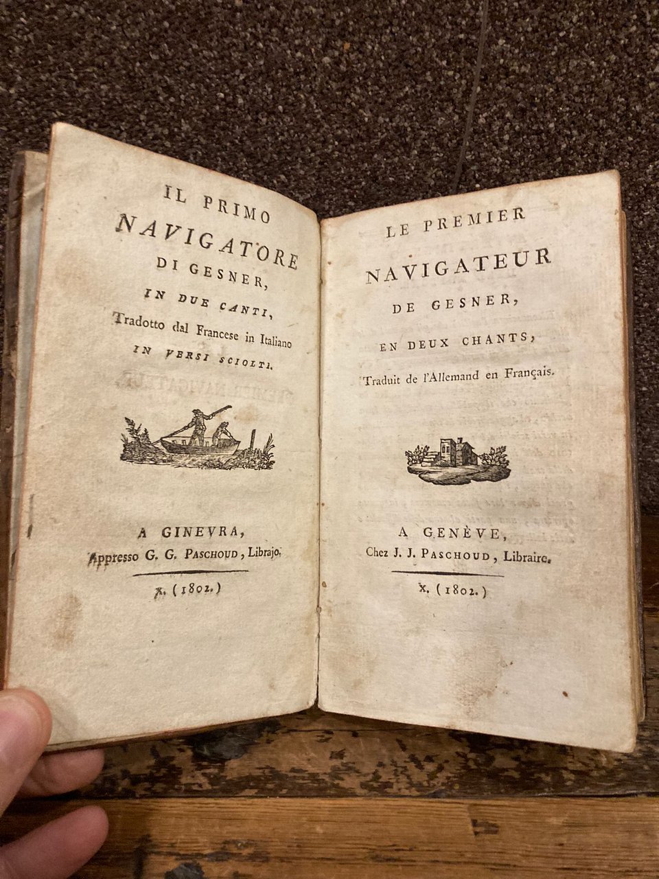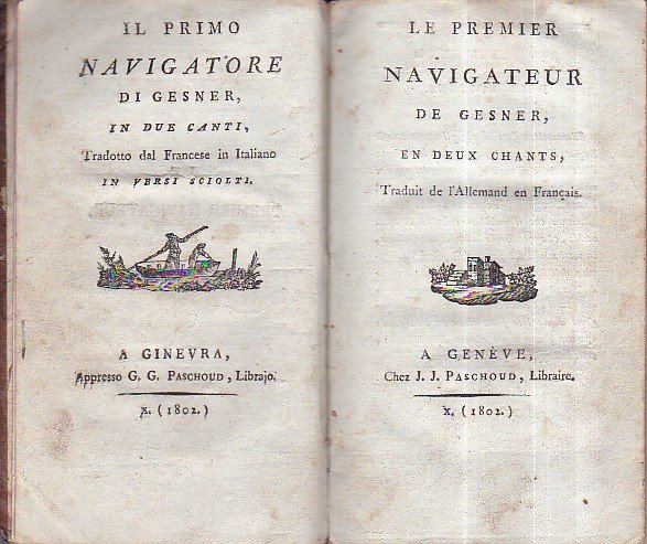 In-8° antico, pp. 131, legatura coeva p. pelle nocciola marmorizzata con filetti e decori floreali dorati al dorso. Tagli rossi. Testo bilingue, italiano nelle pp. in nn. pari, francese in quelle in numerazione dispari. Doppio frontespizio, italiano e francese, con due differenti vignette xilografiche. Rinfreschi alla legatura, sparse fioriture interne. Firma di possesso del tempo al contropiatto posteriore. Ristampa ginevrina della prima traduzione italiana di questo poema di Gessner. Il traduttore, non indicato, è Giulio Perini.