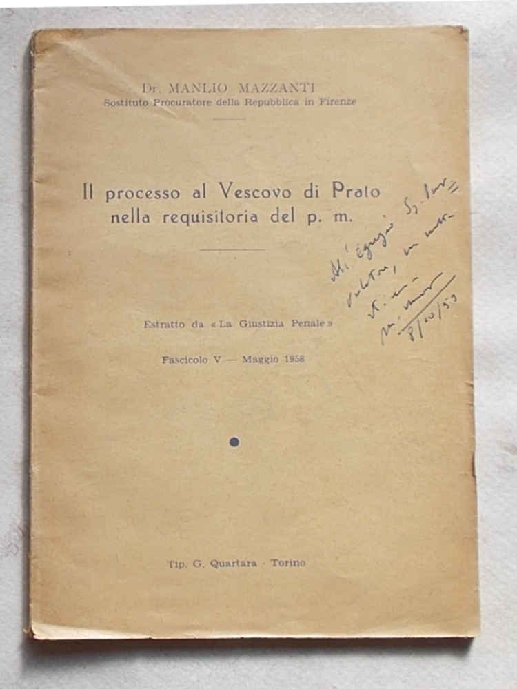 In 16° (cm. 16,5 x 11,5); pagg. 76; brossura originale. VG. ** Con dedica autografa, quasi certamente dell'Autore (Sostituto Procuratore della Repubblica in Firenze) in copertina. Estratto da "La giustizia penale" fasc. V - Maggio 1958.