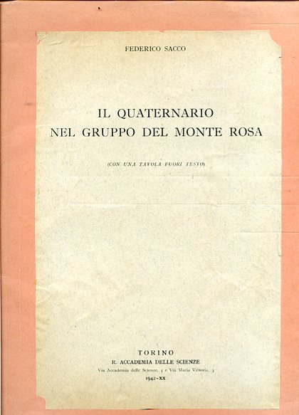 In-4°, pp. 19, brossura originale. Una grande carta ripiegata in fine incisa in litografia a colori da Salussolia di Torino con schema geologico del quaternario nel gruppo del Monte Rosa. Estratto fuori commercio dalle 'Memorie della Reale Accademia delle Scienze di Torino', serie seconda, tomo 70, parte prima (1940-1942). Memoria letta nell'adunanza del 3 dicembre 1941. Bibliografia finale.