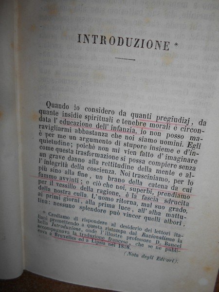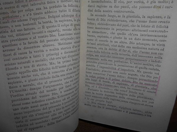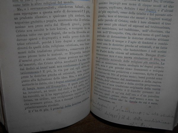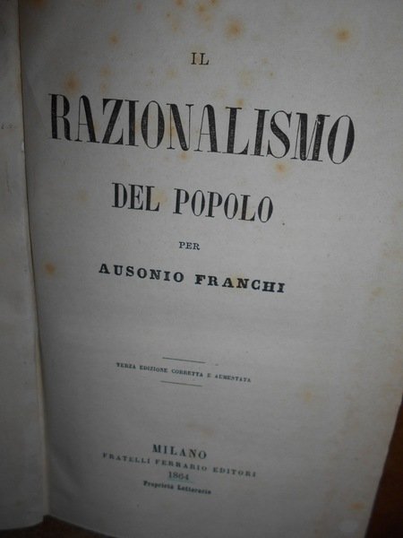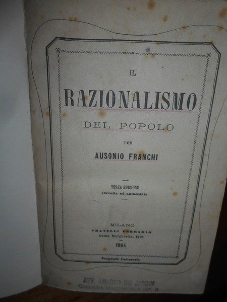 FRANCHI, Ausonio. Milano, Fratelli Ferrario, 1864. Il Razionalismo del popolo. Terza edizione corretta e aumentata. In-16°, tela con titolo in oro entro tassello al dorso, copertina originale conservata. xv, 336 pp. con sottolineature e qualche nota a margine ma in ottimo stato di conservazione in legatura nuova con brossura originale conservata. Neg. esot. mob. 60