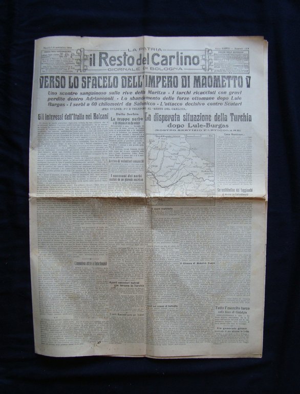 Periodico, Il Resto del Carlino" Anno XXVIII N 309 6 Novembre 1912 "Verso lo Sfacelo dell'Impero di Maometto V " Bologna, 1912; cm 58x42, pp.8. Numero completo. Condizioni di conservazione Esemplare in buone condizioni con tracce d'uso, pieghe di conservazione che si presentano leggermente ingiallitee con piccoli strappetti; per le condizioni vedi foto. SC03.D14221F blu "