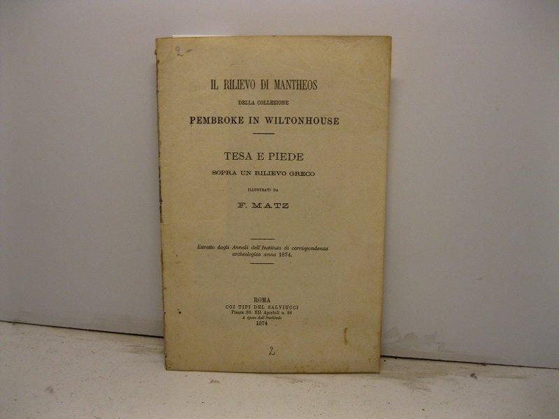 In 8, pp. 12 con 2 tavv. f.t. incise all'acq. a doppia pagina. Br. rifatta. Saggio relativo al rilievo di Mantheos della collezione del conte Pembroke. Si tratta di una lastra di marmo greca raffigurante un efebo che si avvicina a Giove seduto in trono.