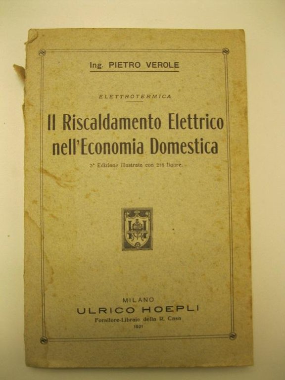 In 16, pp. 216 + VIII. Con moltiss. fig. n. t. Br. ed. con fioriture al p. ant. e danni al d. L'autore fa notare come l'eccessivo costo del carbon fossile e dell'elettricita' non favorisce certamente una Nazione ancora impegnata nella guerra. Interessantissimo repertorio deegli antesignani dei nostri termosifoni